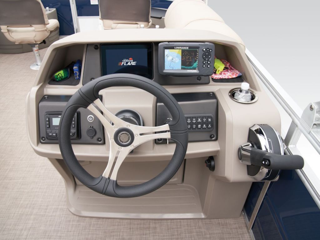 - 9' (2.74 m) SUN TRACKER® QuickLift™ Bimini top w/LED courtesy lights, storage pockets & protective boot (color-coordinated Black w/Charcoal fencing or Sand w/Indigo Blue fencing)