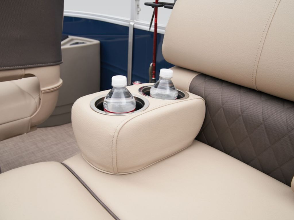 - Front fishing station w/2 pedestal seat bases; rail-mounted rod & tool holders; & starboard bow storage compartment w/rod & drink holders