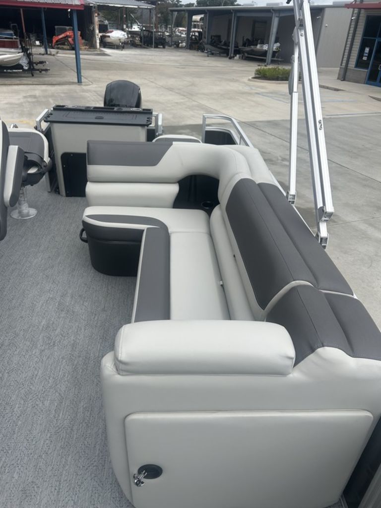 Anglers will never want to leave this fishing pontoon boat's deck. And with fore and aft fishing decks featuring 32 gal. of capacity between 2 livewells, 4 removable and foldable fishing chairs, and a 10' QuickLift® bimini top to stay cool under, there's no reason to leave! But if you have to, the lockable rod compartment lets you rest easy until your next fishing trip.