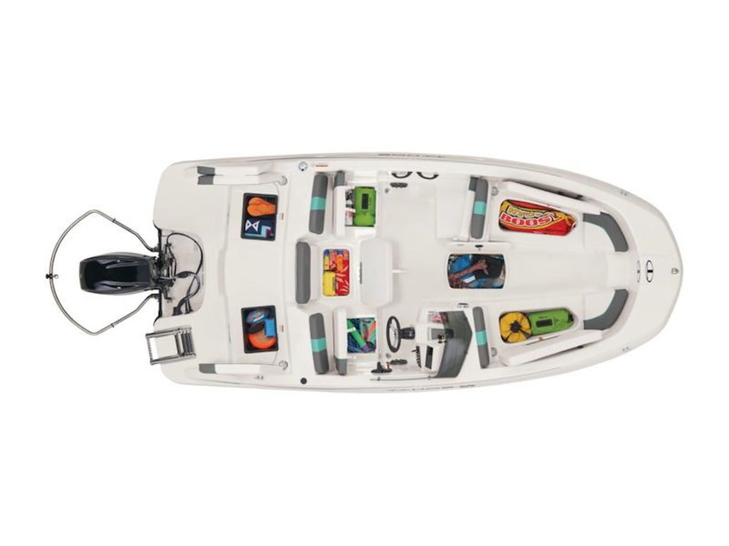 Relax on the water in this boat's midship bench seating and twin forward lounges with under-seat storage. The bow seats have reversible backrests that turn them into spotter seats. Lay out on the aft sun pad when you find your cove. The 4-step telescoping aft boarding ladder makes it easy to get back on the swim platform after diving into the water. Flip-up seat cushions and flip-down seat backs let passengers board the boat without stepping on upholstery. Claim 1 of the 9 drink holders, find your song on the 2-speaker Kicker® stereo, and search for excitement on the water!