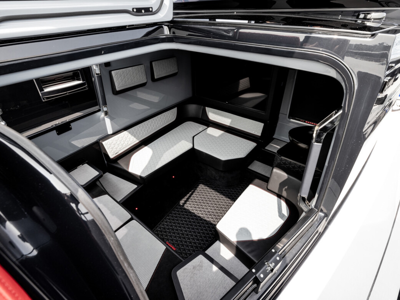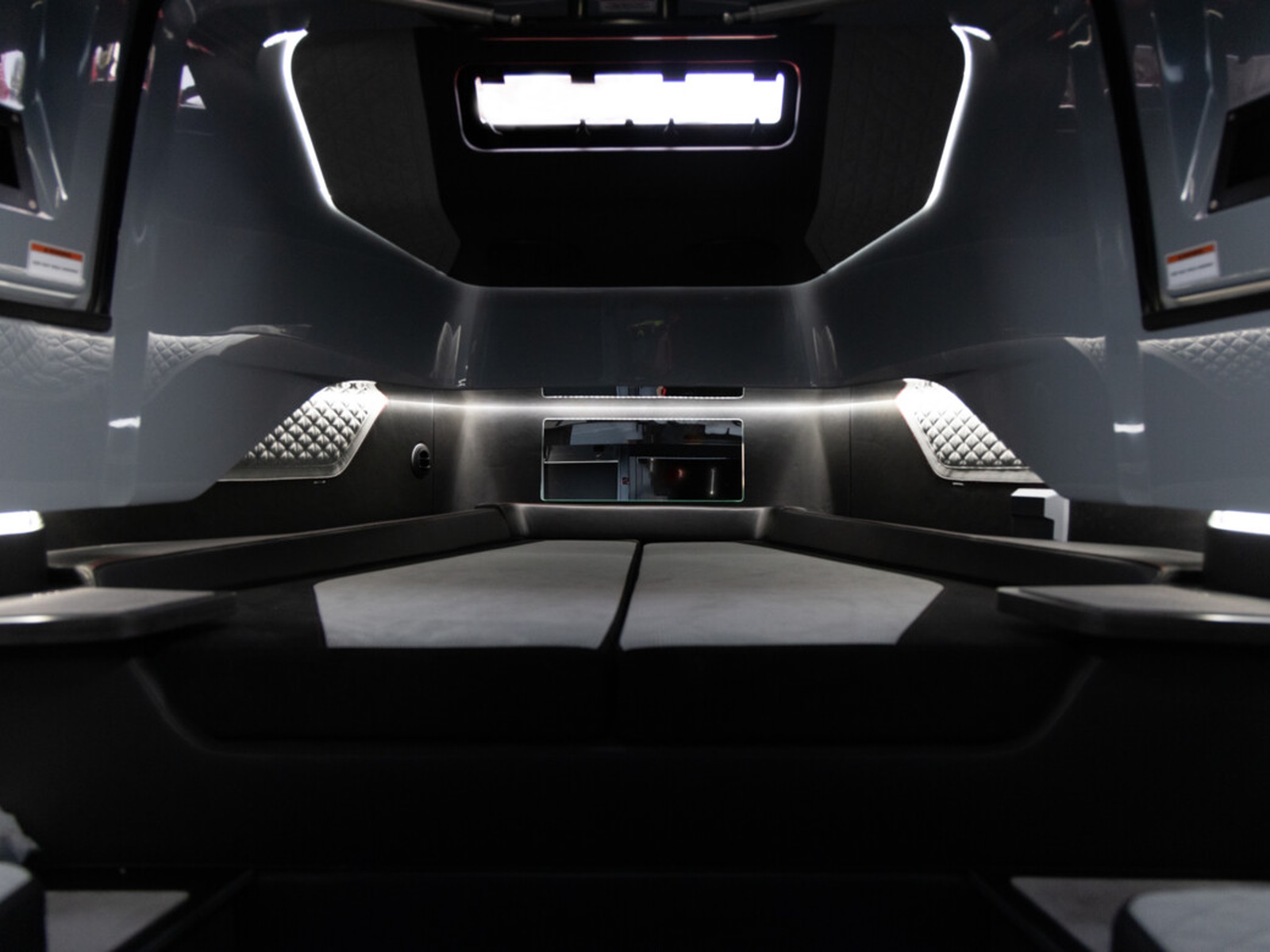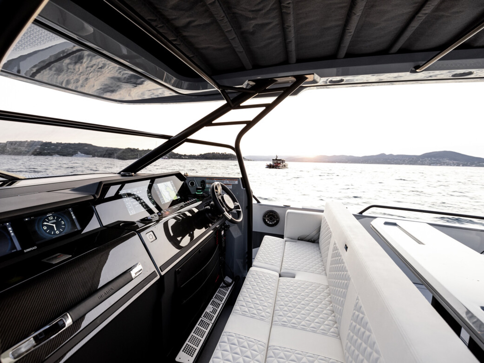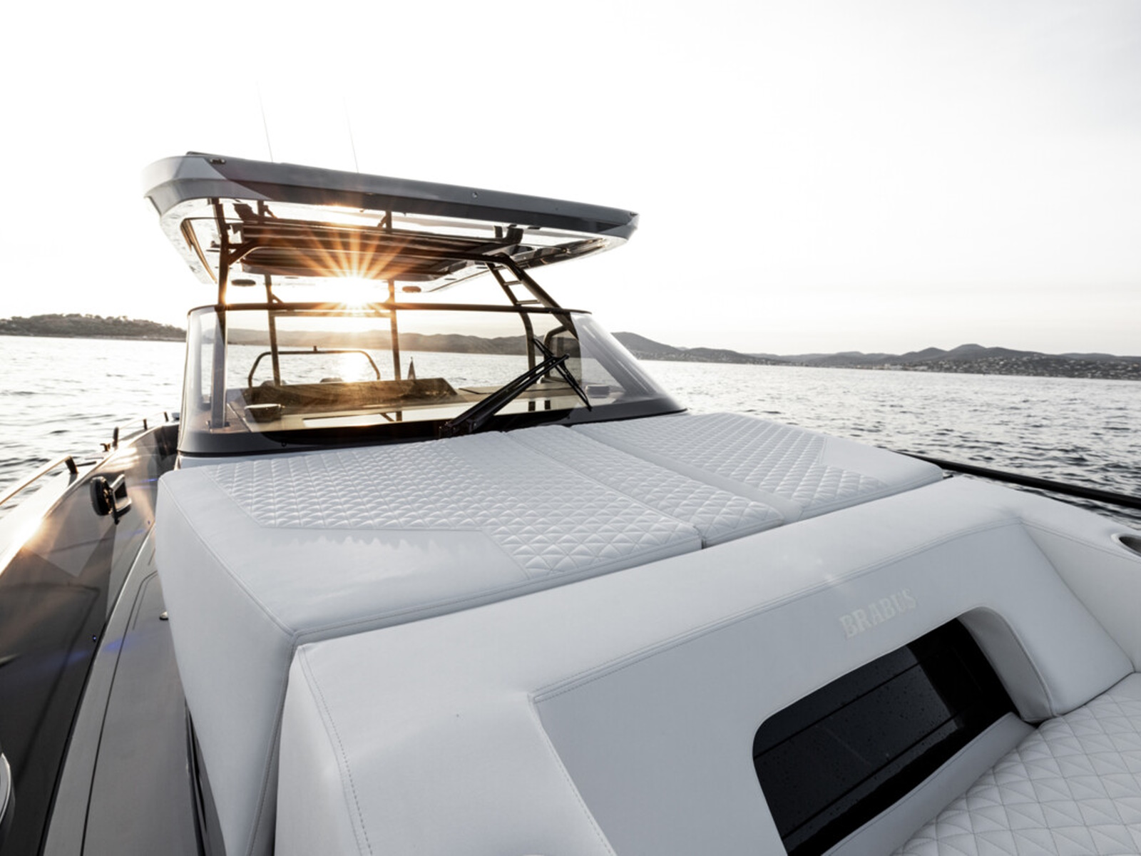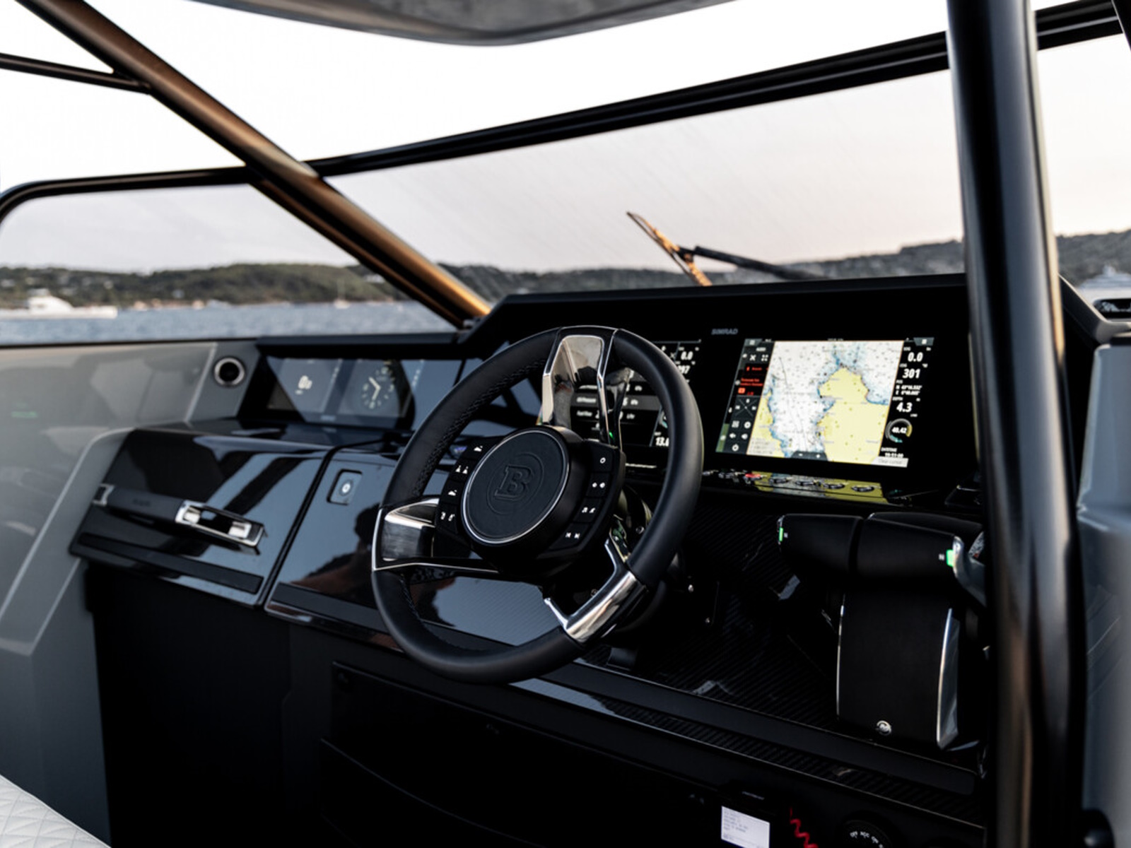 Smart-safety and electronics - The BRABUS Shadow 900 features a wide and expansive Simrad® full width, touch-screen ‘Glass Helm Information Display' with a customizable, state-of-the-art BRABUS User-Interface, offering a selection of driver-orientated sport modes, access to the boat’s main navigation, engine management, on board entertainment and driving-assist features. The Intelligent Steering Module with integrated trim tab, bow thruster and audio controls enables to control the boat even smoother than ever before. In the quest for a more driver-focused, more up to date and seamless looking appearance, the helm area is free of unnecessarily cluttered instrumentarium.