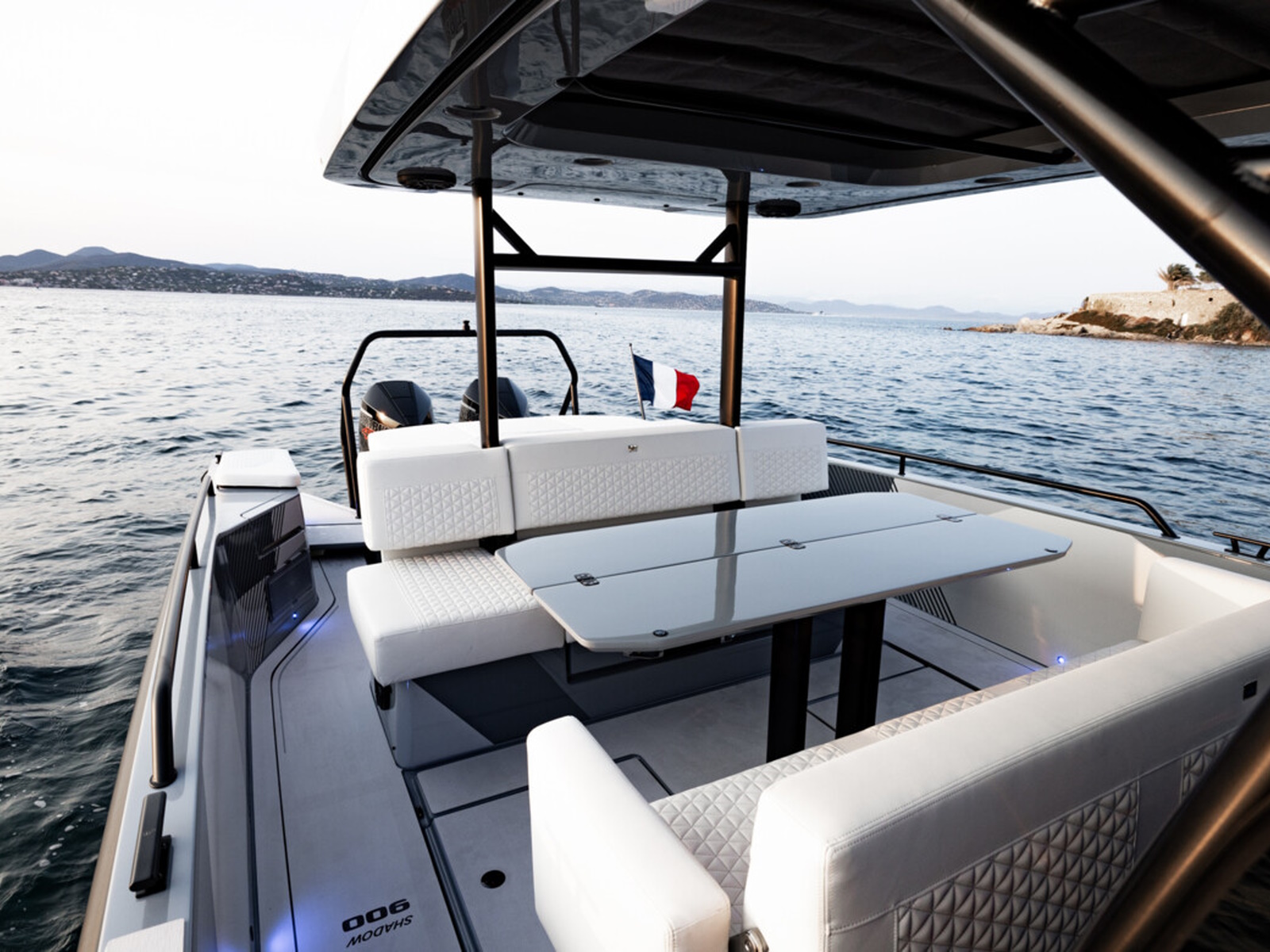 Onboard ambience - The Shadow 900 onboard experience is enhanced with Fusion Marine Entertainment System with audio set-up of 6 x 6” speakers, 2 x 4” speakers, 1 x 10” subwoofer and 1 x 5ch amplifier. LED deck- and deck ambient lights in blue, the Front Lounge LED lights in white and Underwater transom lights in bi-color, white and blue.