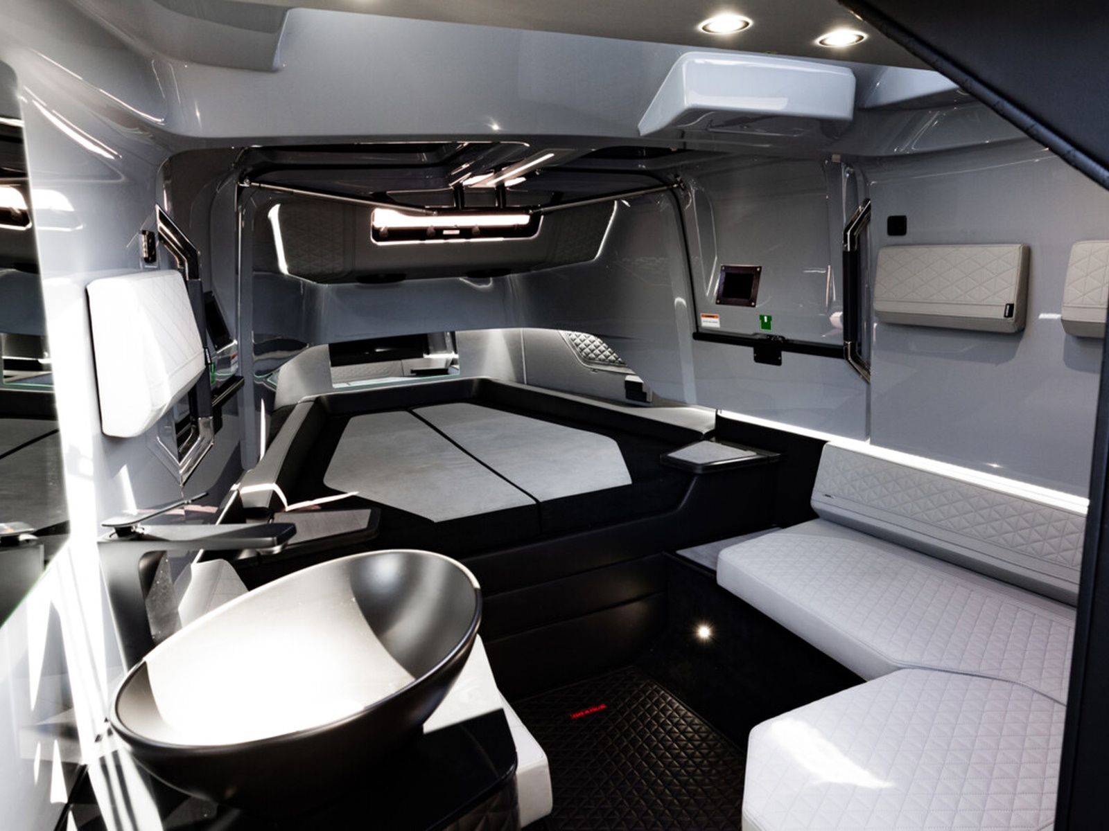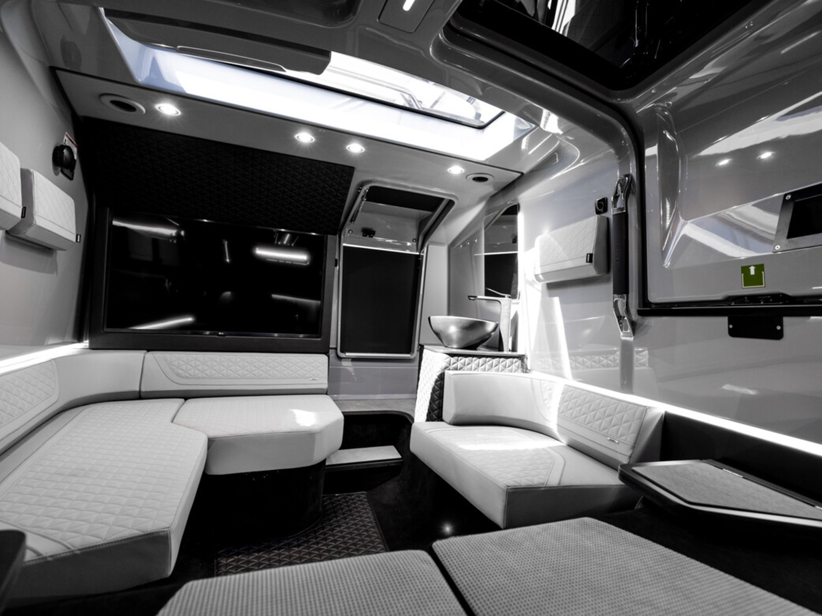 Luxurious front lounge - Experience premium comfort and ambience in the front cabin with a ‘queen size’ sleeping accommodation. Refined down to the last detail, you can choose between a sophisticated BRABUS Fine Leather light gray mono-tone or BRABUS Fine Leather black/light gray dual-tone, accentuated with either red or gray stitching and piping. Extend the lounge experience with an optional integrated infotainment unit, comprising a 42-inch flat screen 4K TV and Apple TV connectivity to mention a few of the options available.