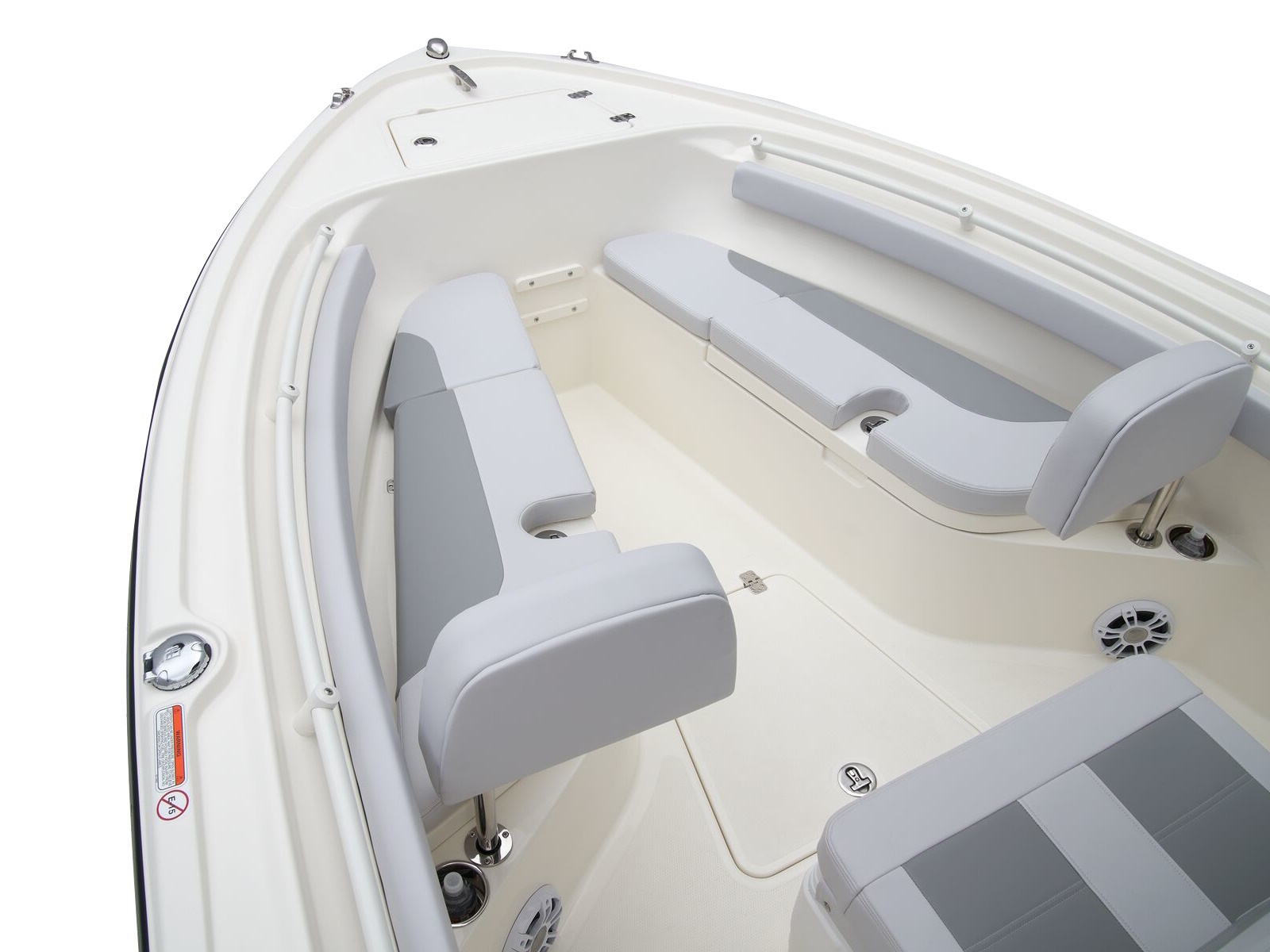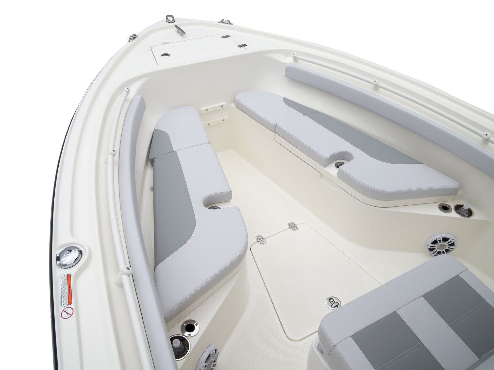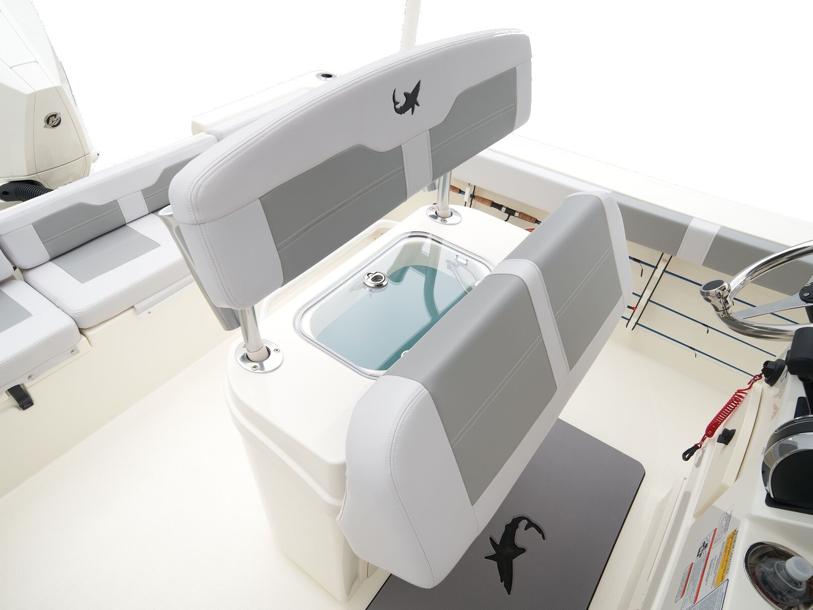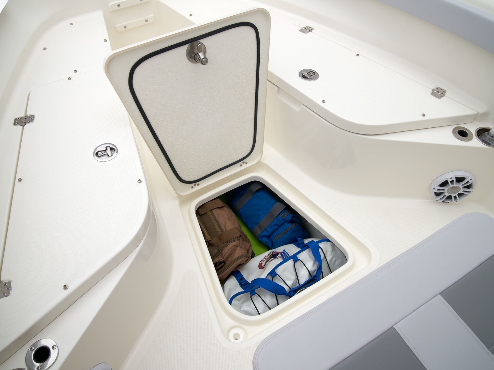 - Port & starboard forward seats w/108-qt. (102.21 L) insulated storage below w/gravity overboard drainage