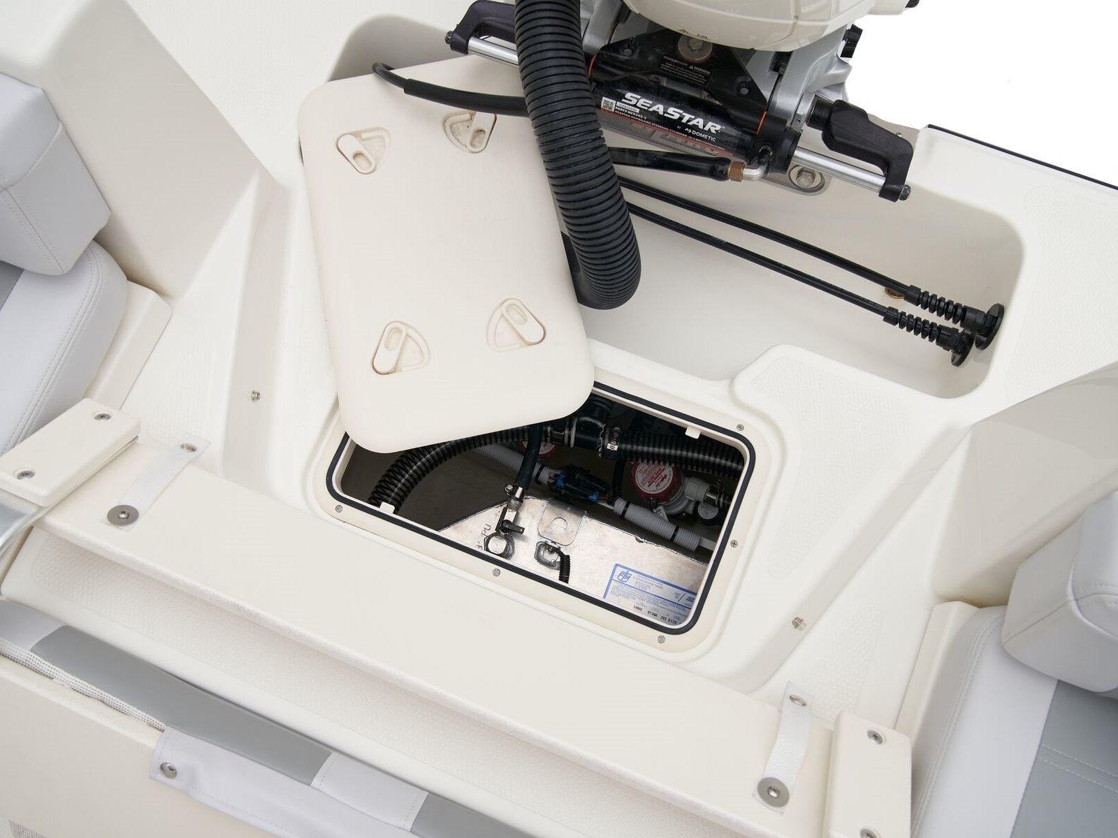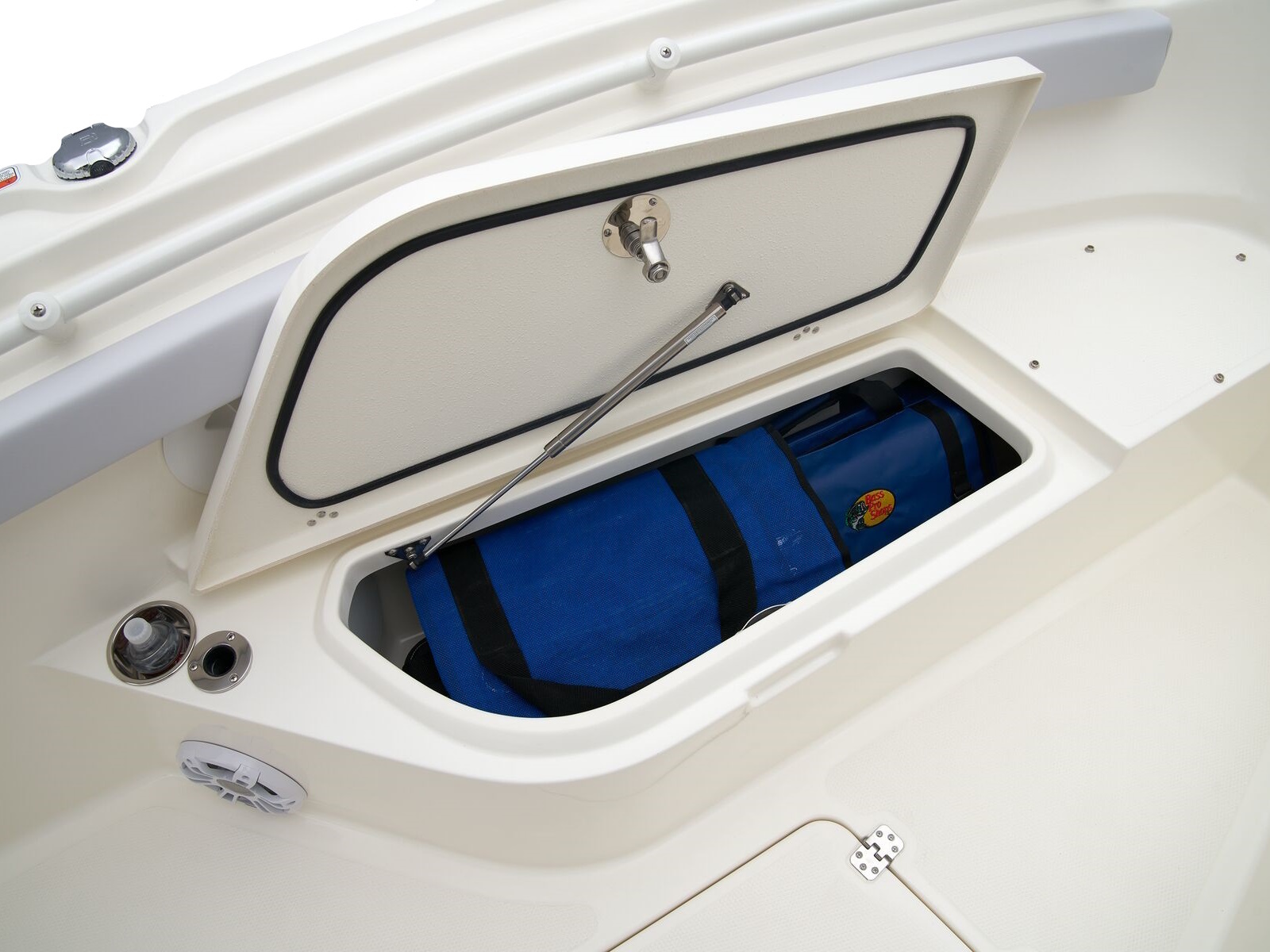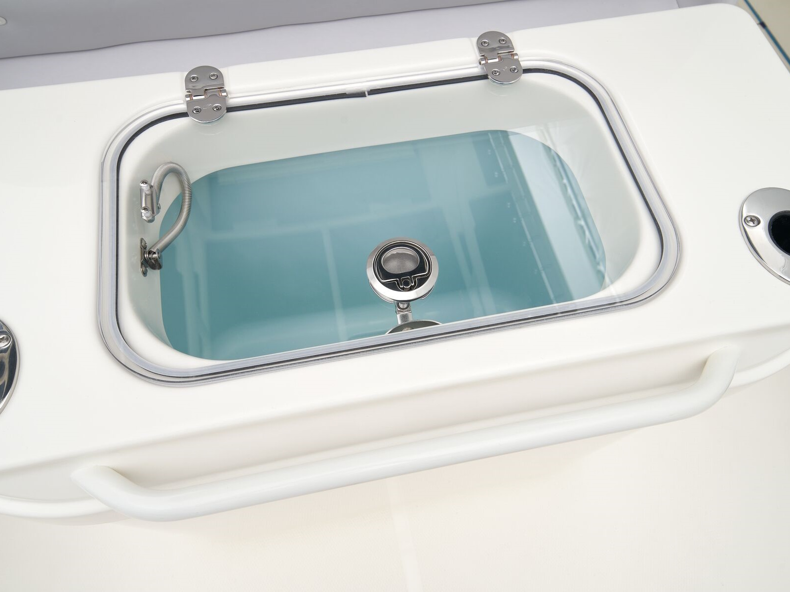 - Port & starboard forward seats w/108-qt. (102.21 L) insulated storage below w/gravity overboard drainage