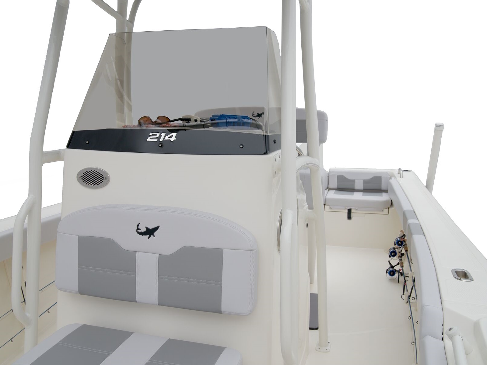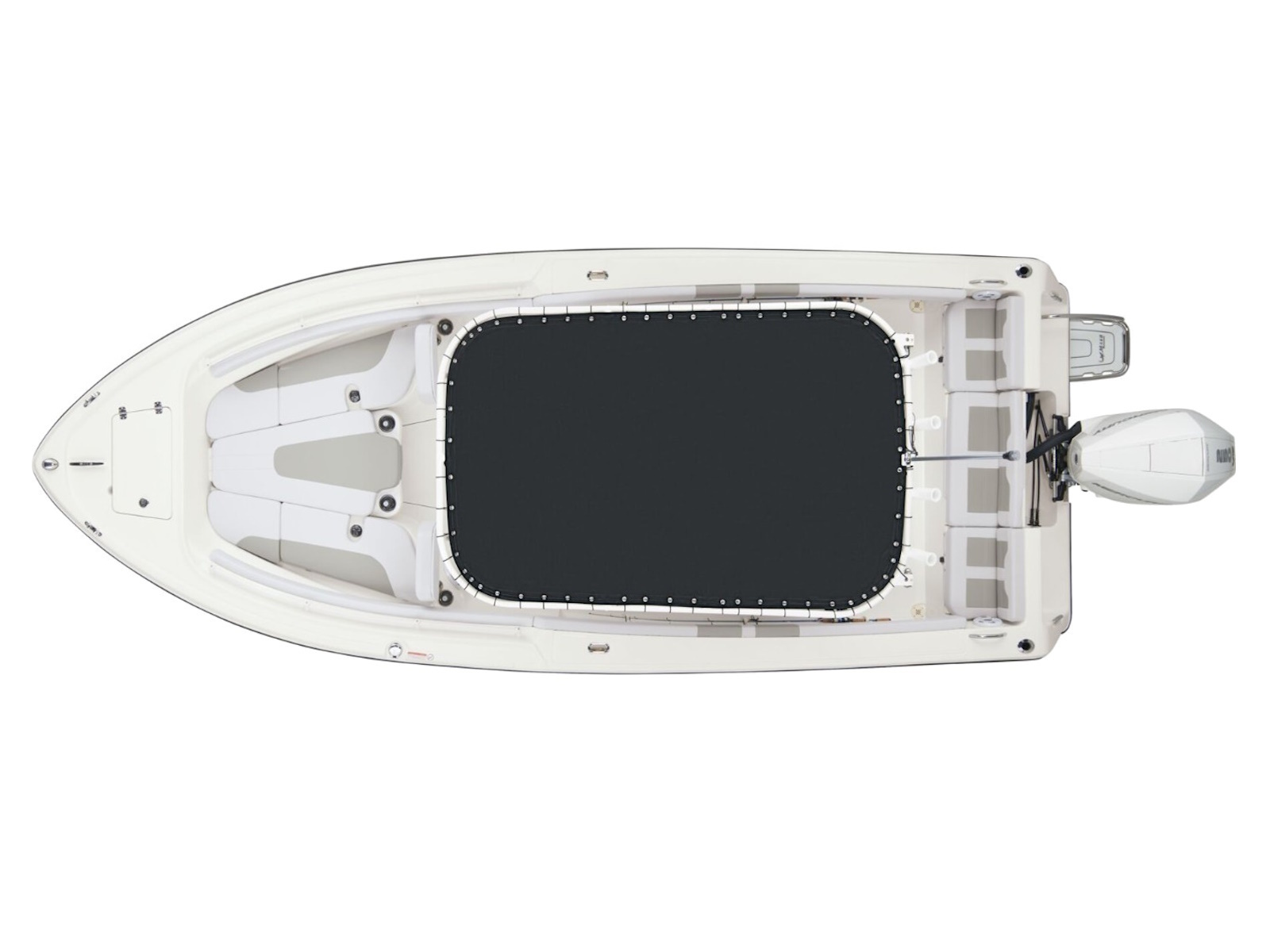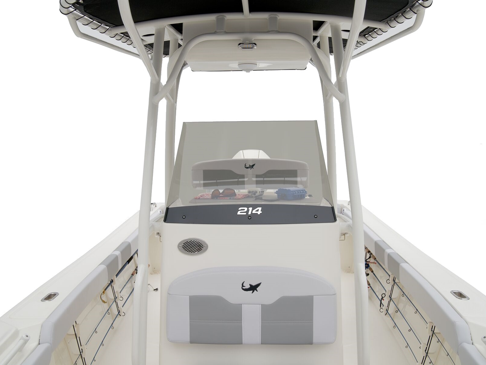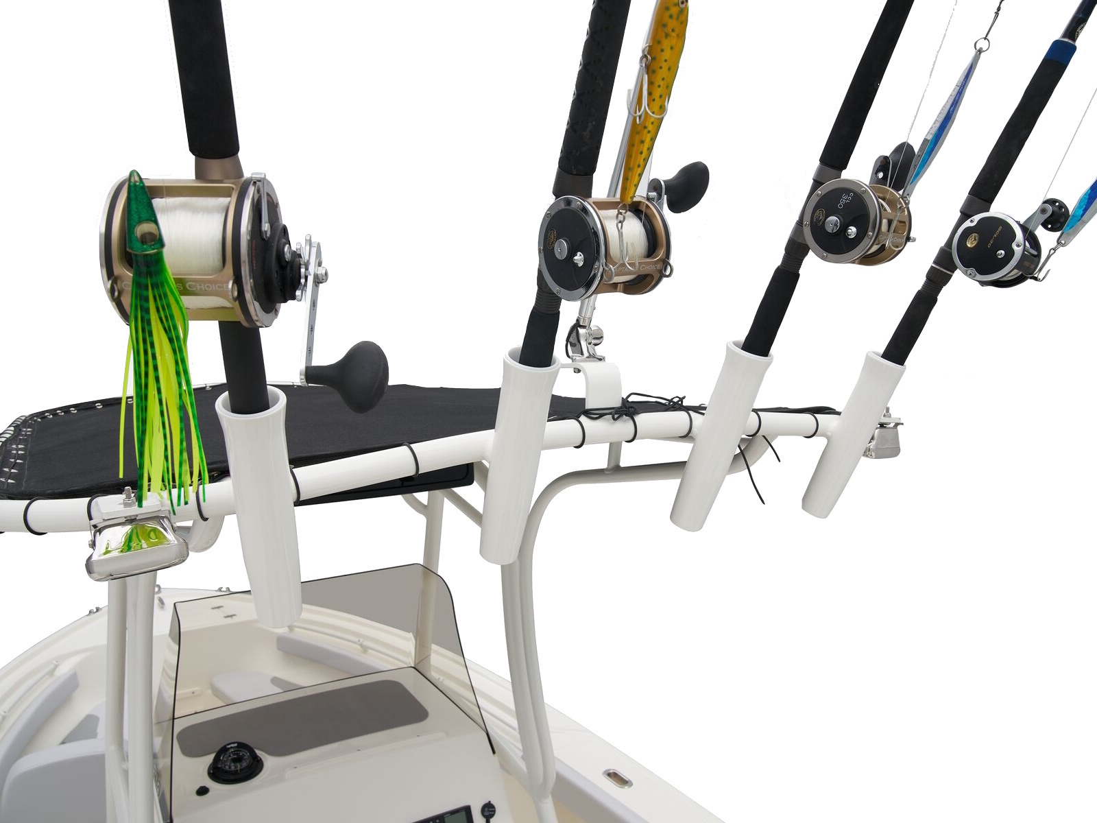 - Outrigger-ready canvas T-top w/4 rod holders, electronics box w/mounting plates for antenna & spreader lights