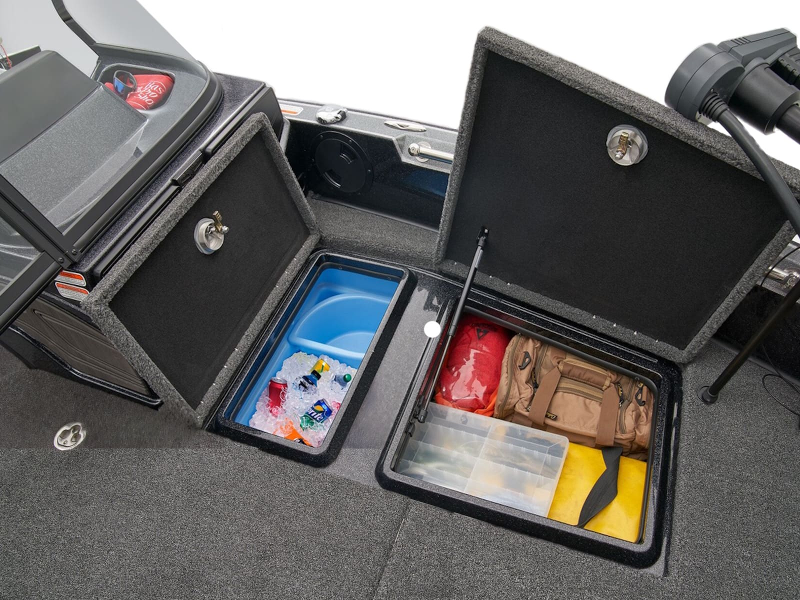 - 2 lift-out, molded & lockable aft storage boxes that will each accept seven 3700 tackle trays