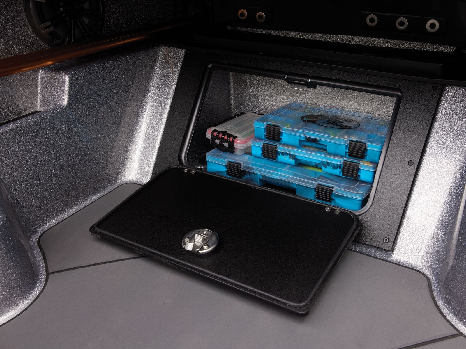 - 2 lift-out, molded & lockable aft storage boxes that will each accept four 3700 tackle trays