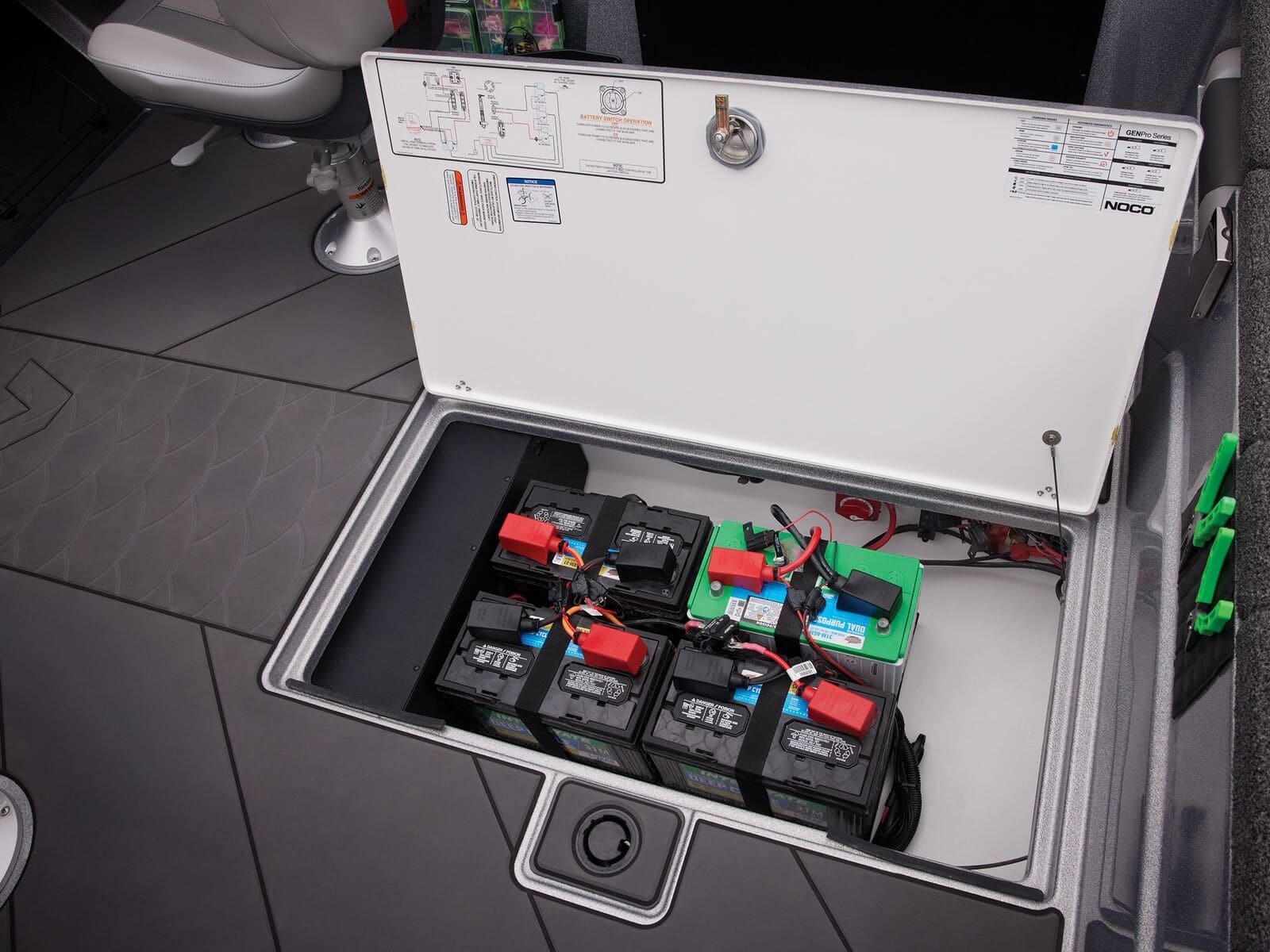 - Midship in-floor storage for 5 batteries