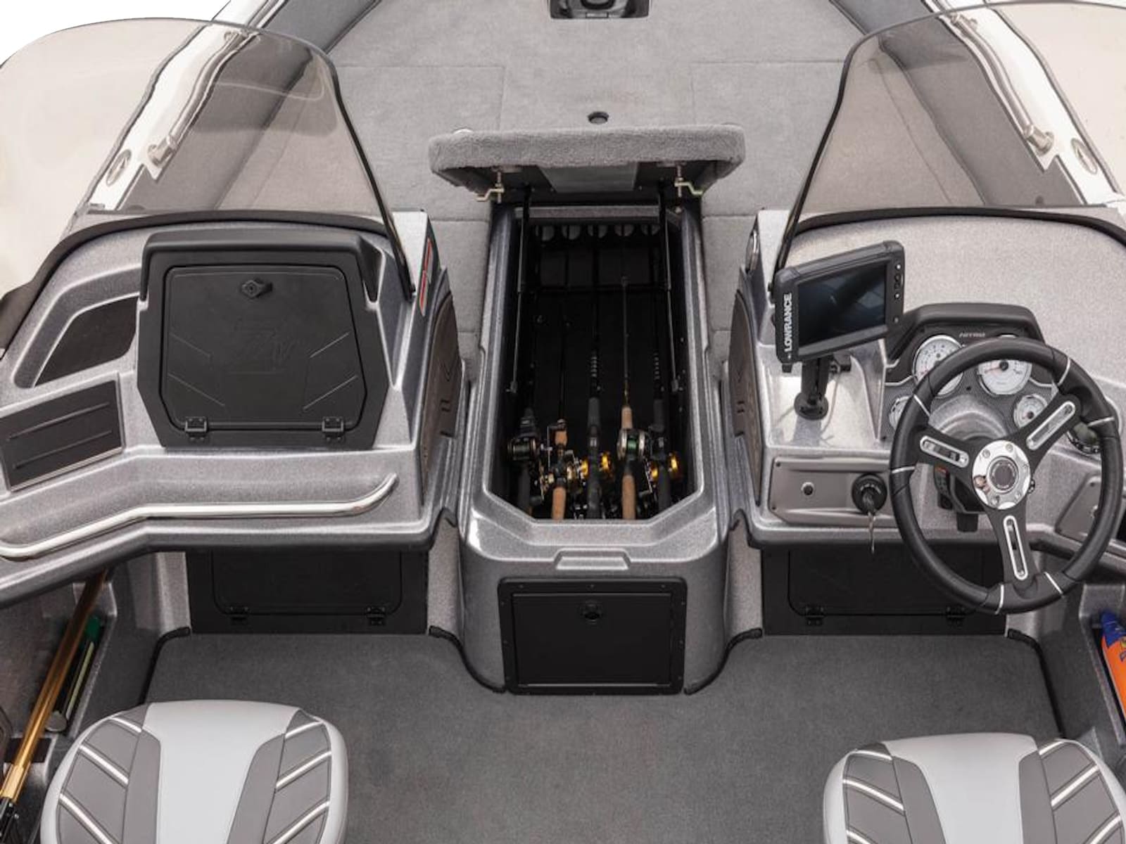 - Bow port & starboard lockers w/lift assists & retractable rod holders w/port tapered rod tube to protect rod tips