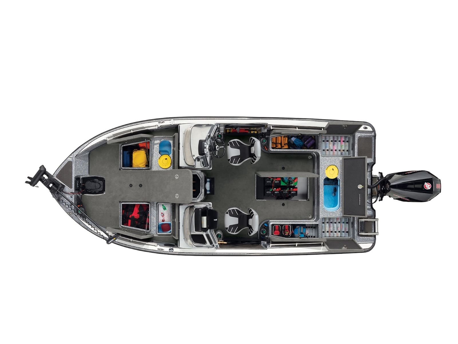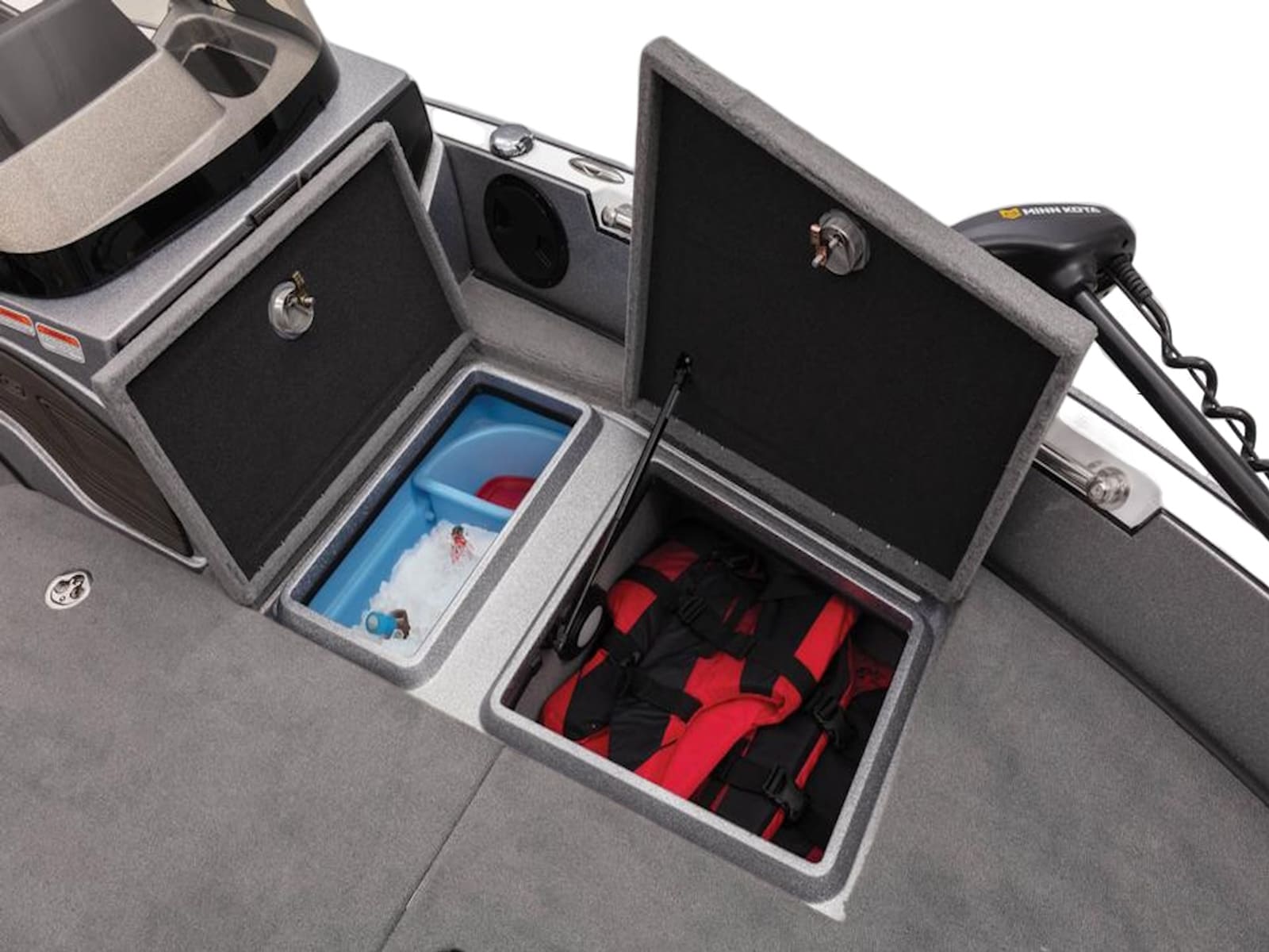 - Midship port & starboard insulated storage boxes designed to accept tackle trays