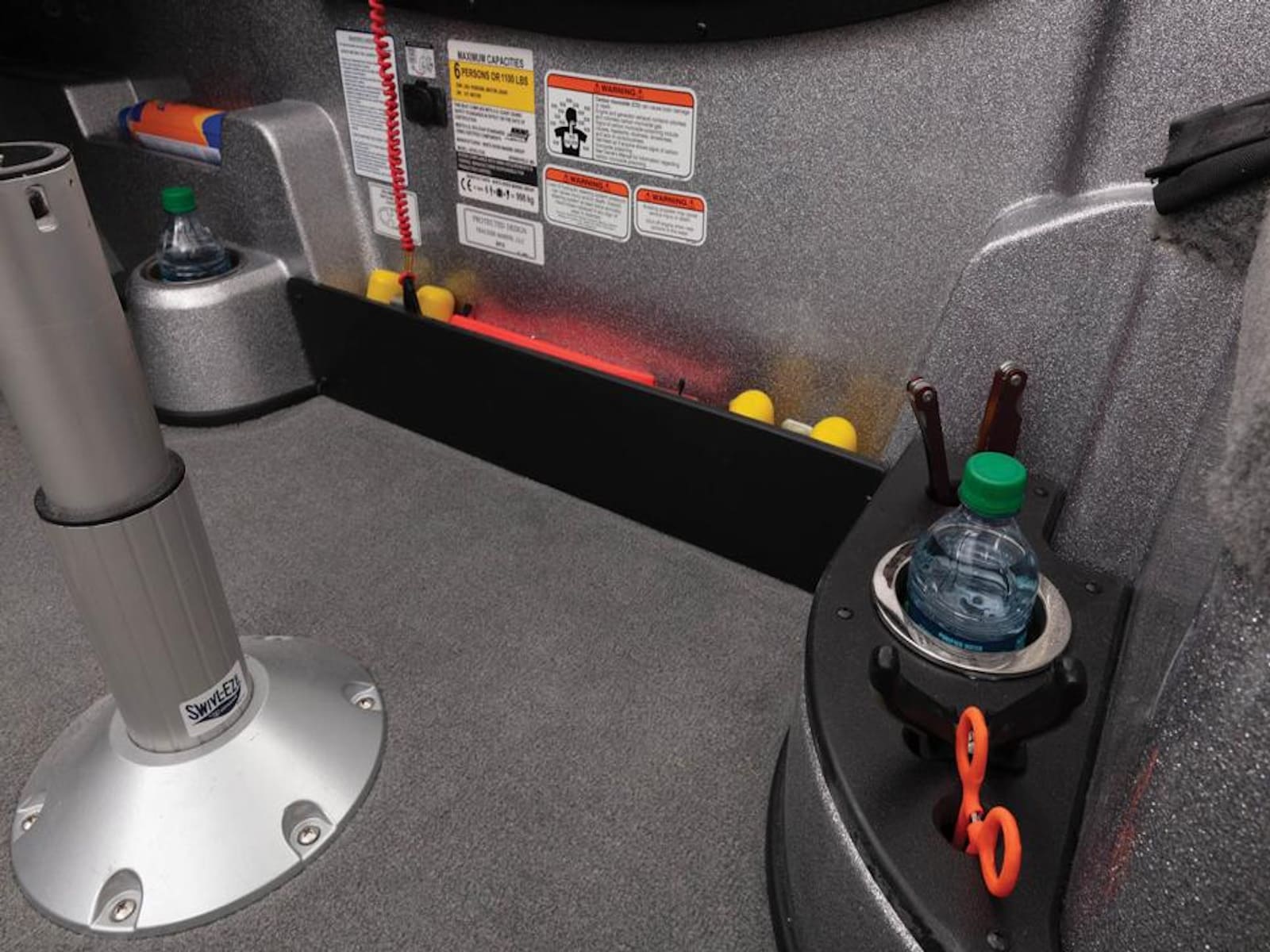- Aft 26-gal. (98.42 L) insulated, rotomolded GUARDIAN™ anti-slosh livewell w/removable divider, bait bucket & rounded corners