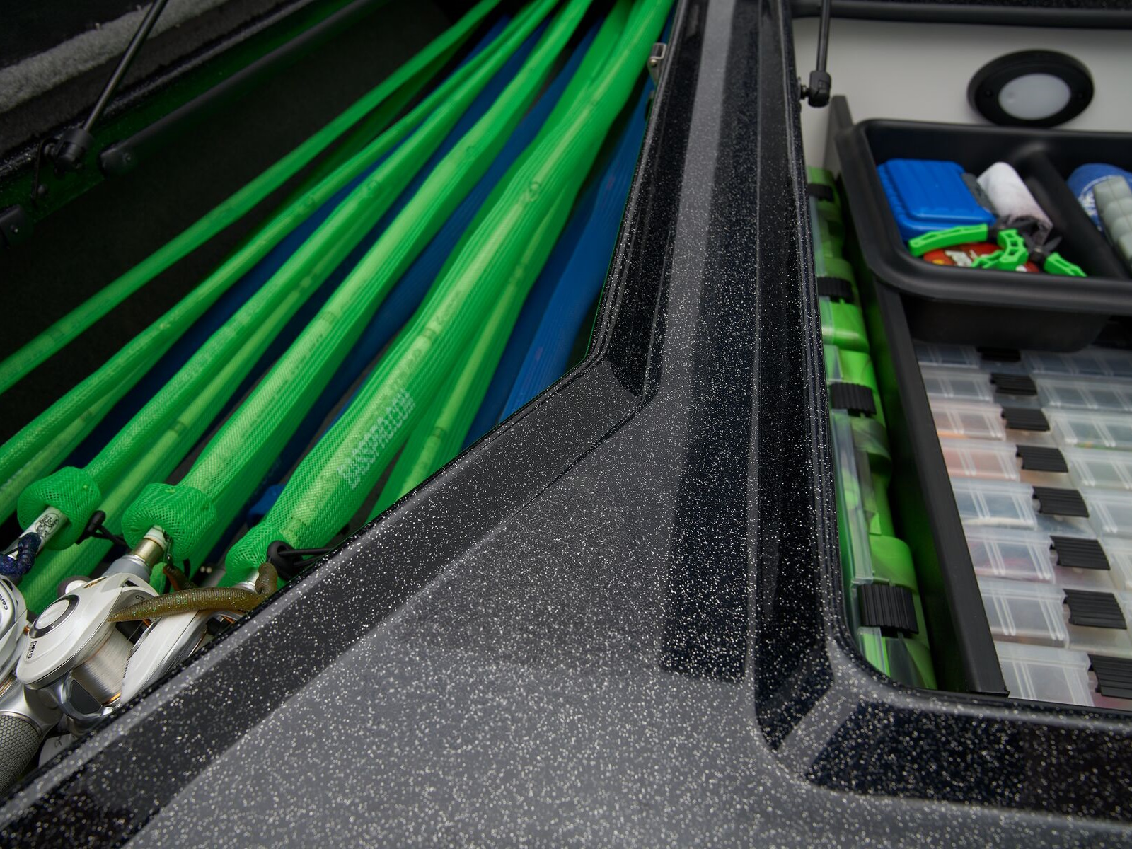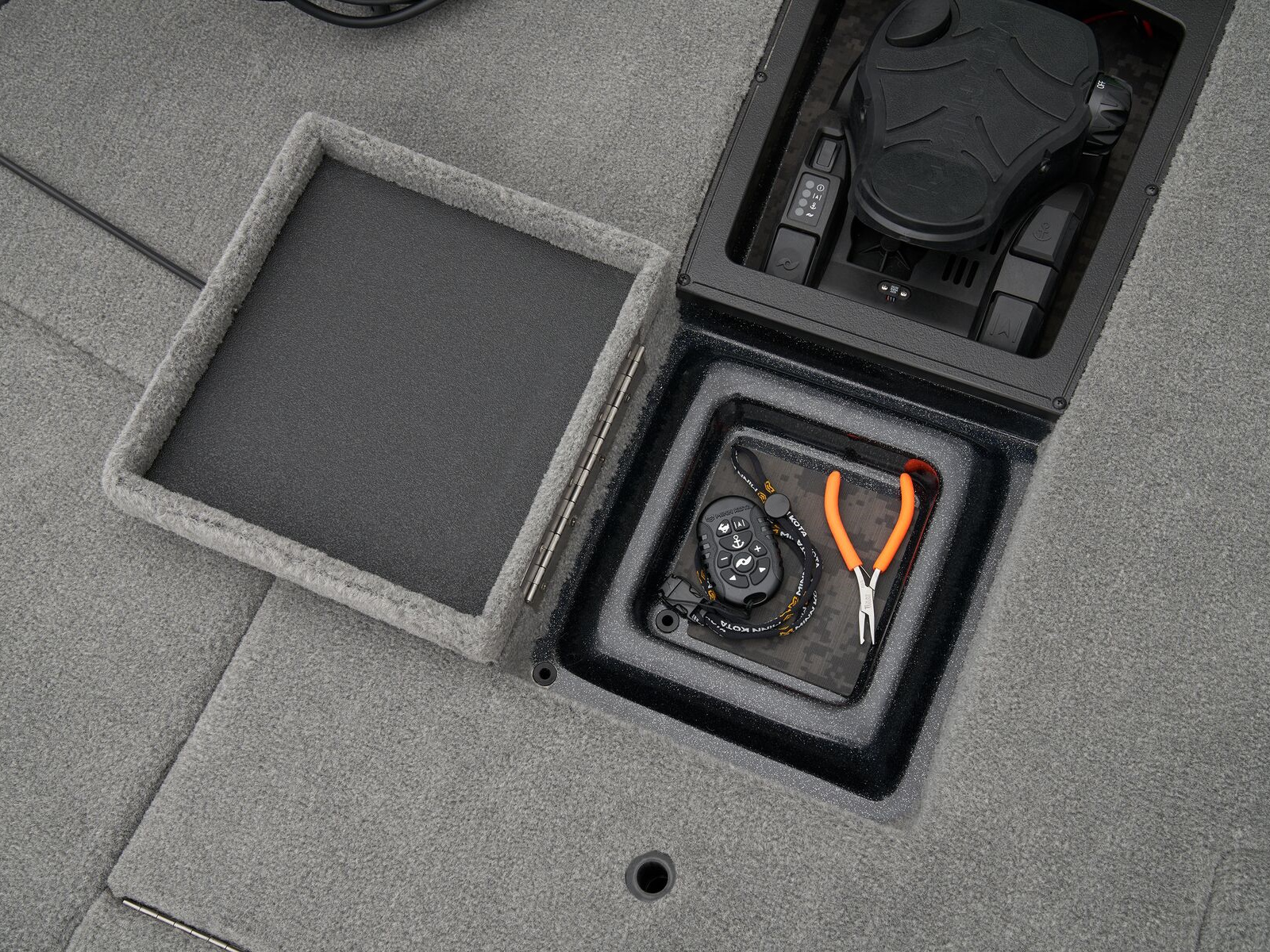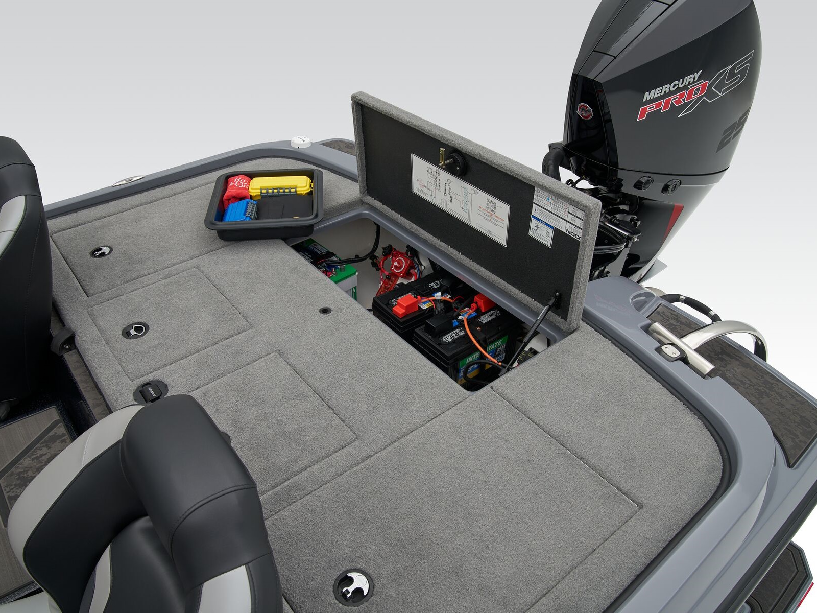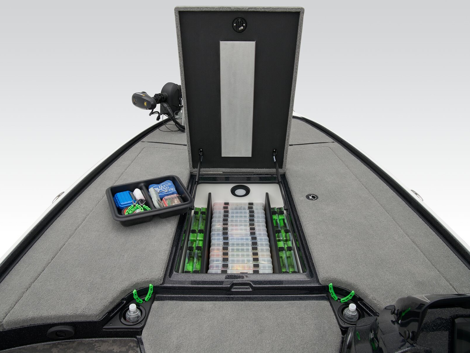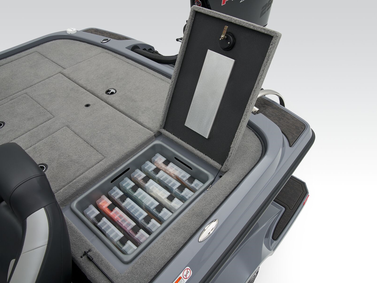 - 2 lift-out, molded aft storage boxes that will each accept seven 3700 tackle trays