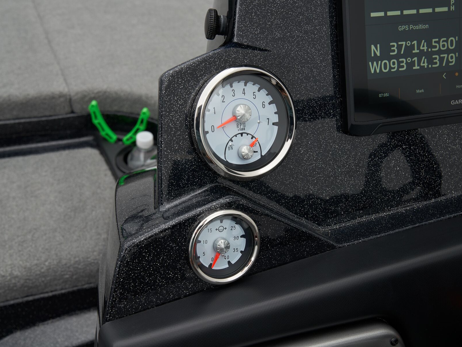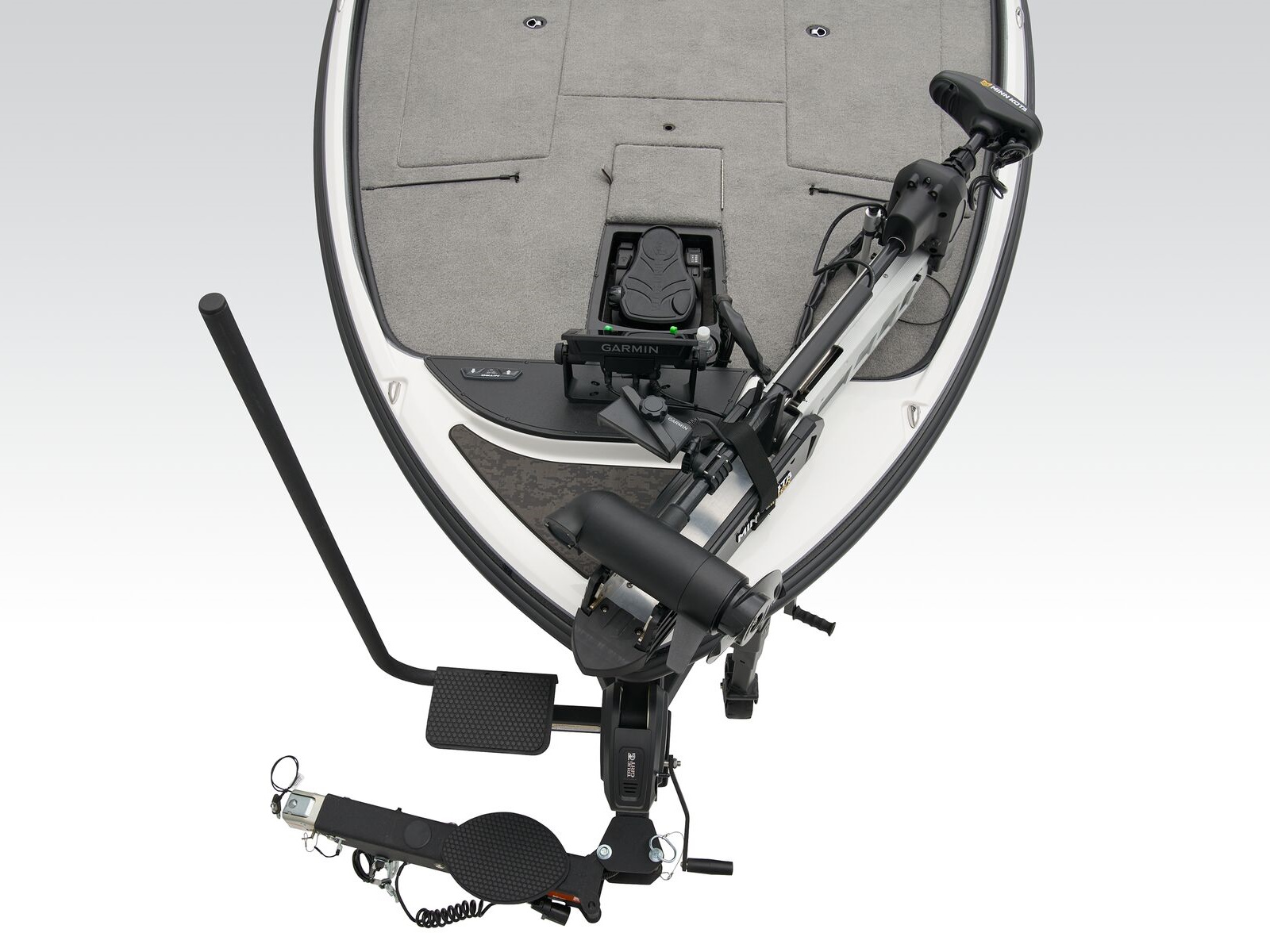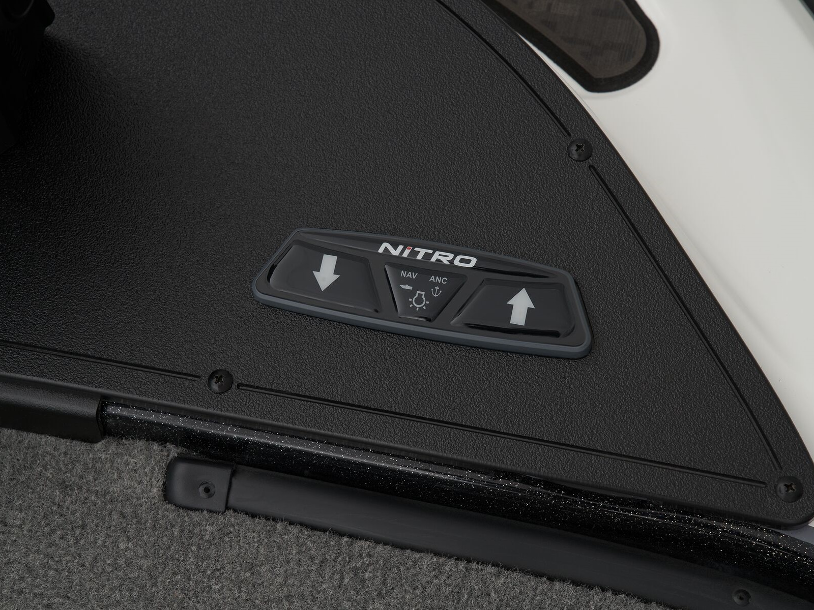 - Angled bow panel w/trolling motor receptacle, anchor/light switch, trim switch & capability to flush mount most 12" (30.5 cm) fishfinders
