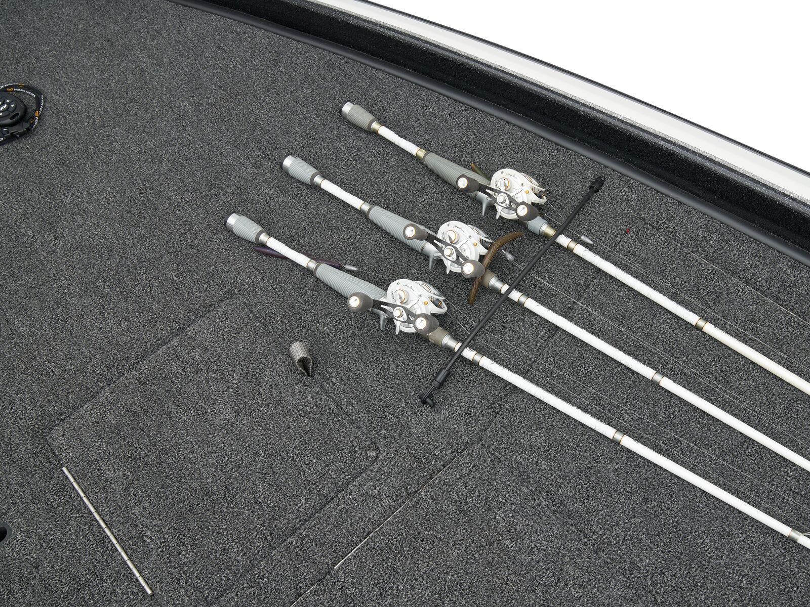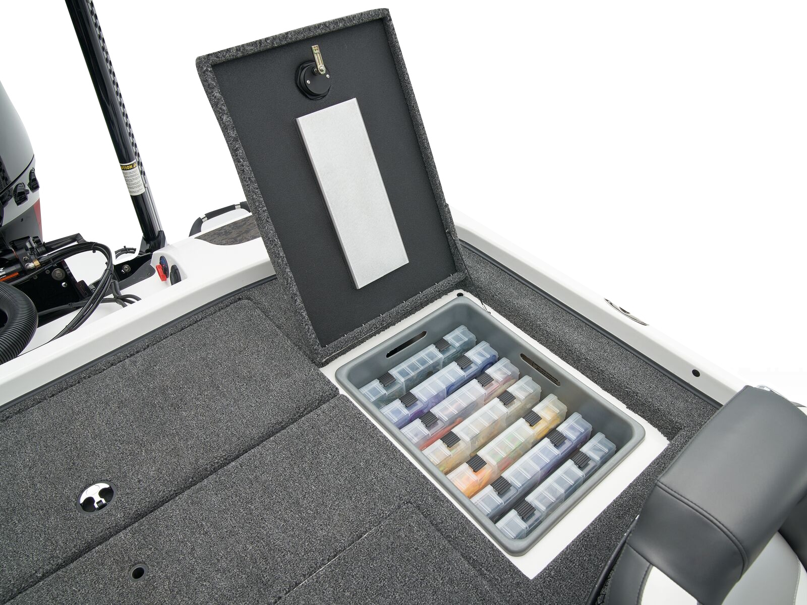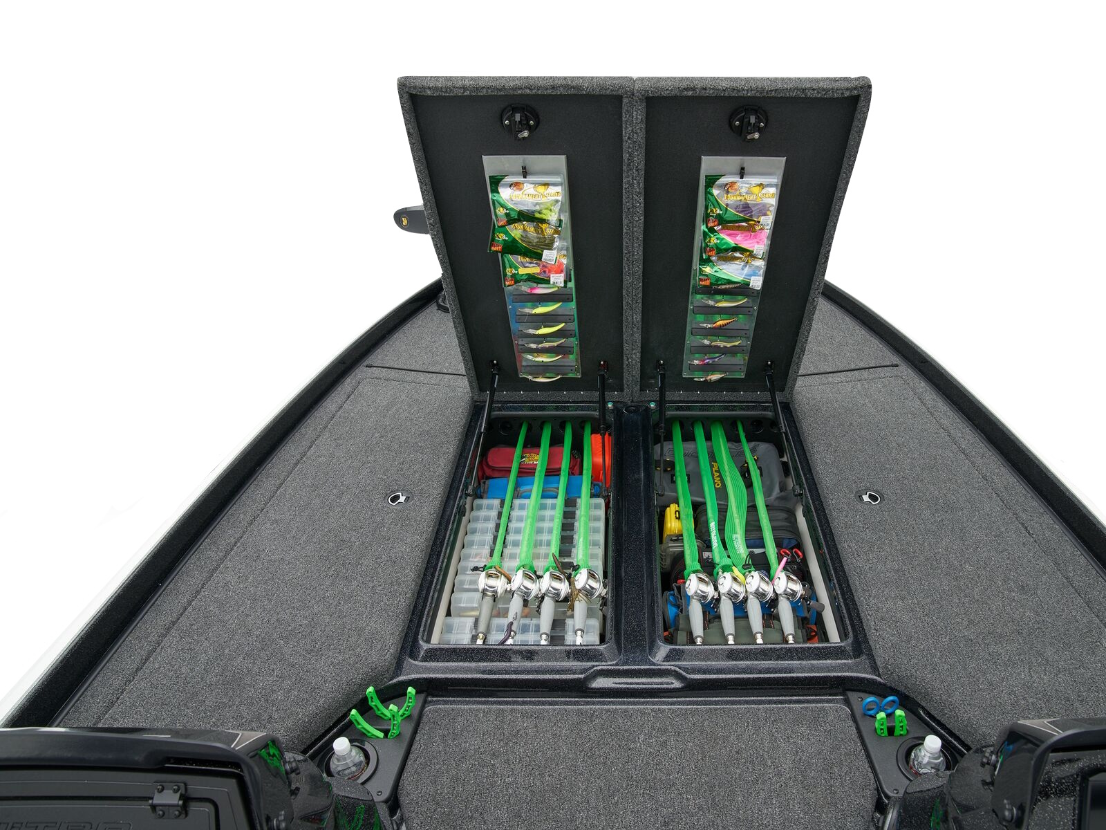 - Oversized, lockable bow port & starboard rod lockers w/lift assists for rods up to 8' (2.44 m) & 23 tapered tubes in port locker