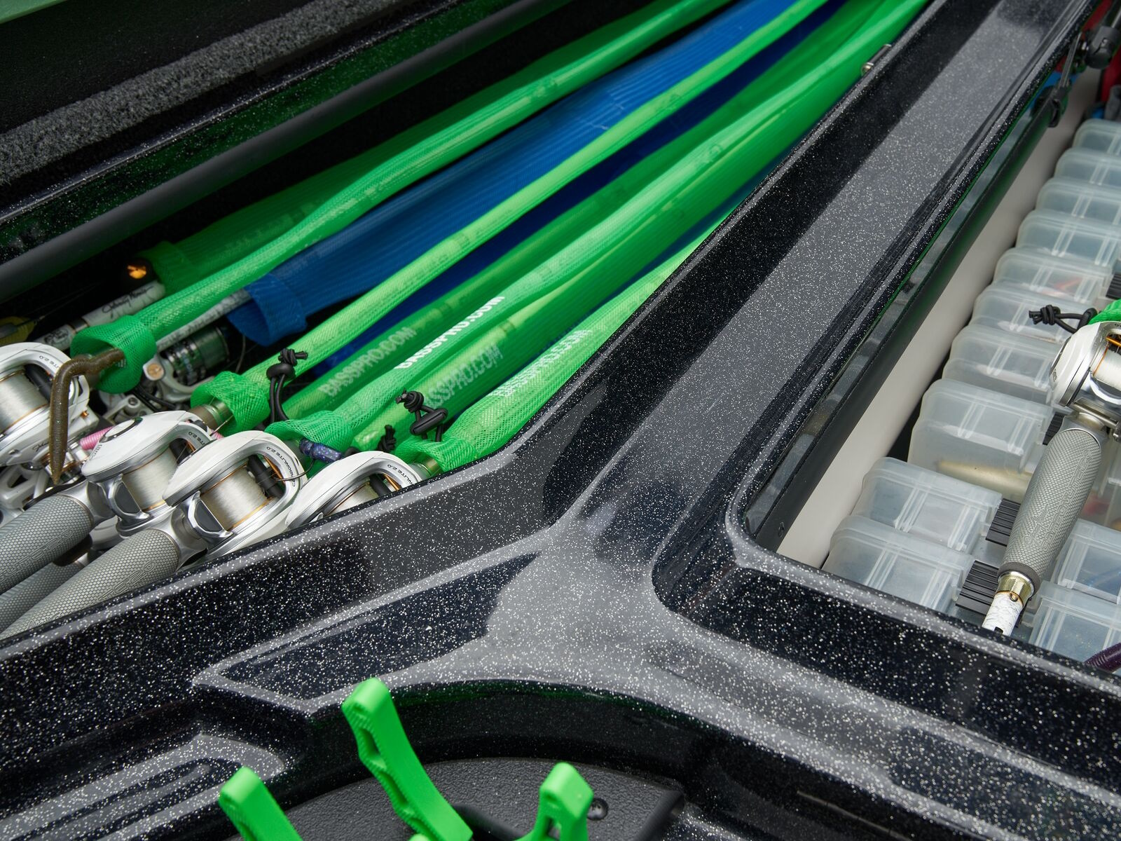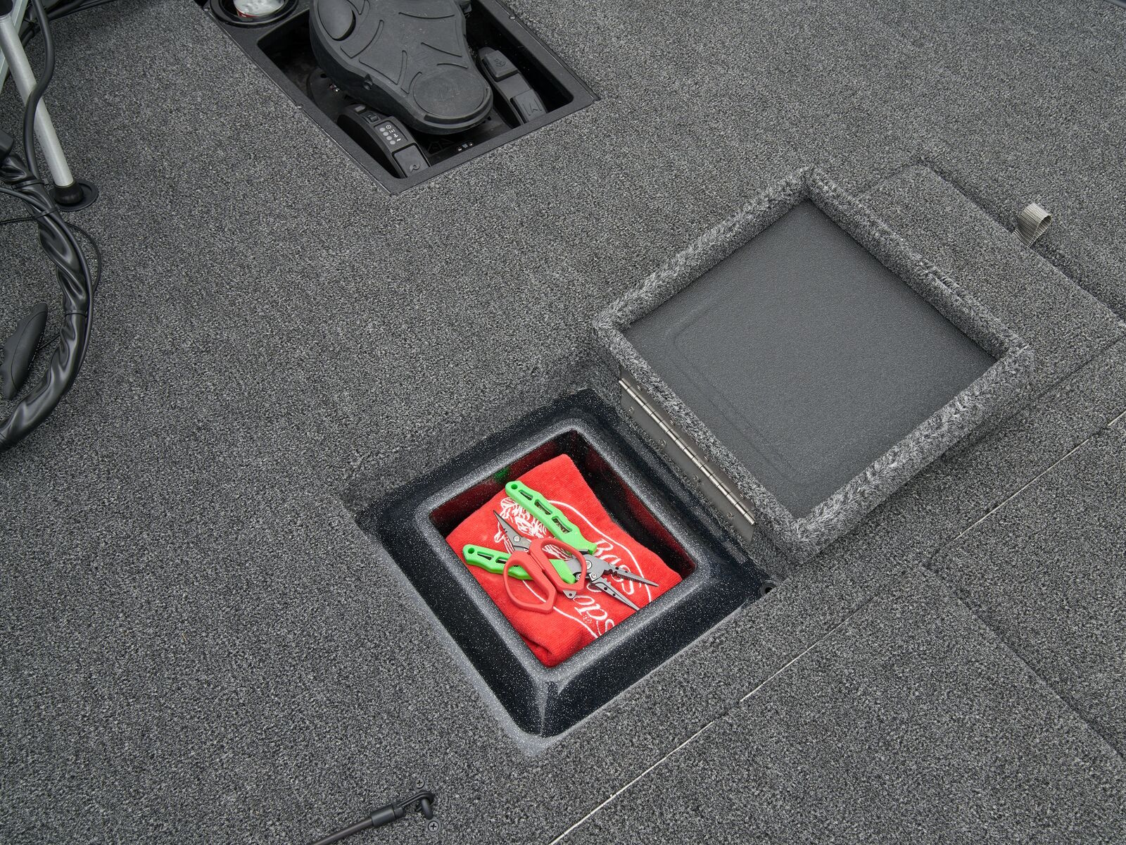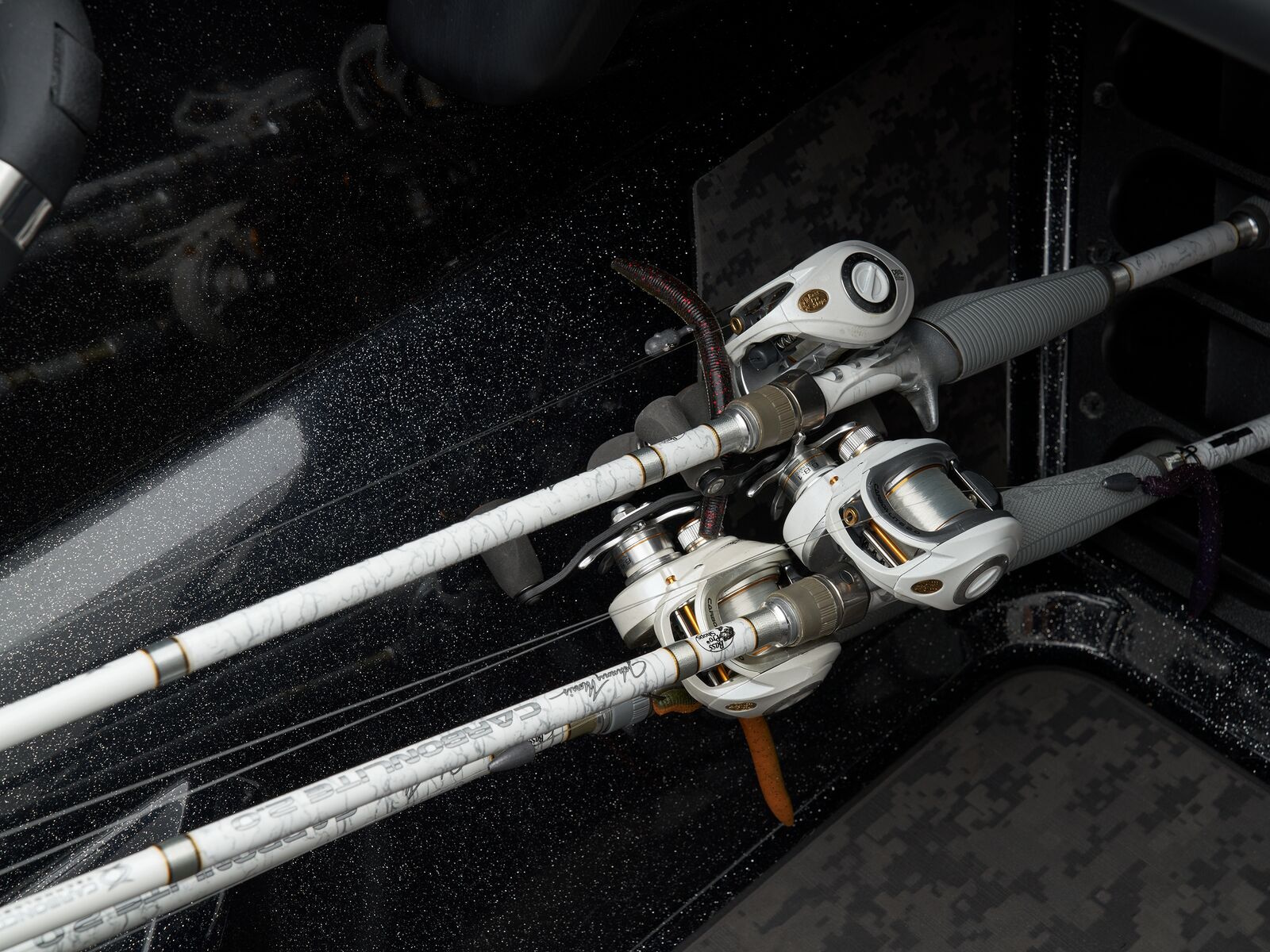 - Oversized, lockable bow port & starboard rod lockers w/lift assists for rods up to 8' (2.44 m) & 23 tapered tubes in port locker