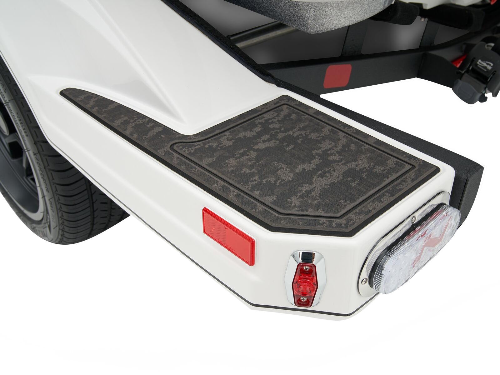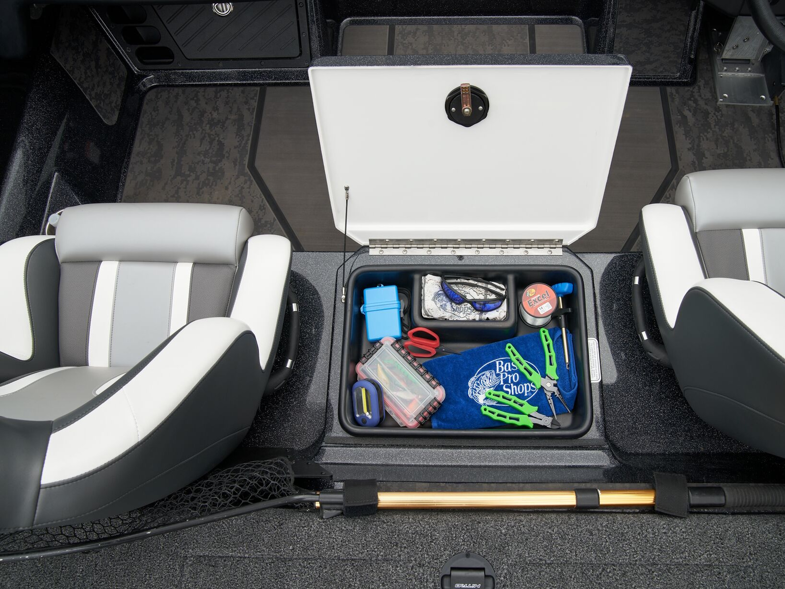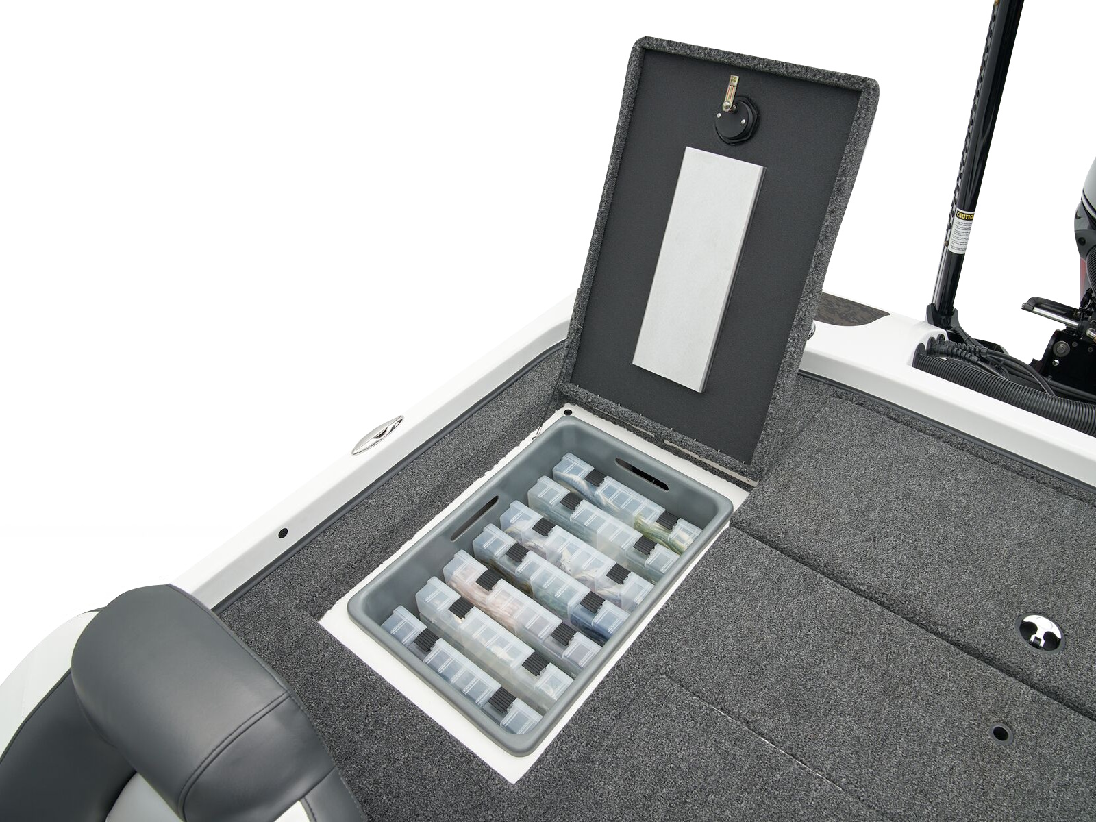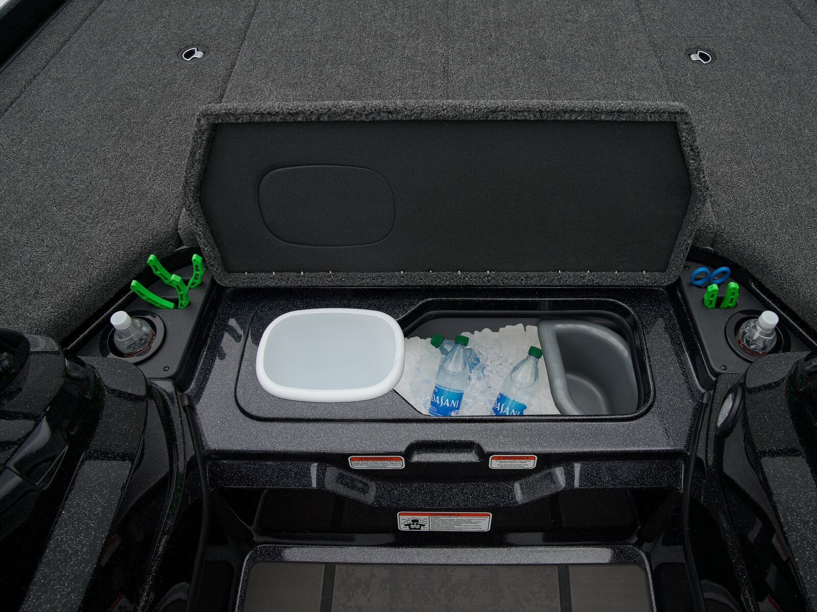 - Step to bow deck w/86-qt. (81.39 L) insulated cooler, removable trash receptacle & snap-in sandwich tray