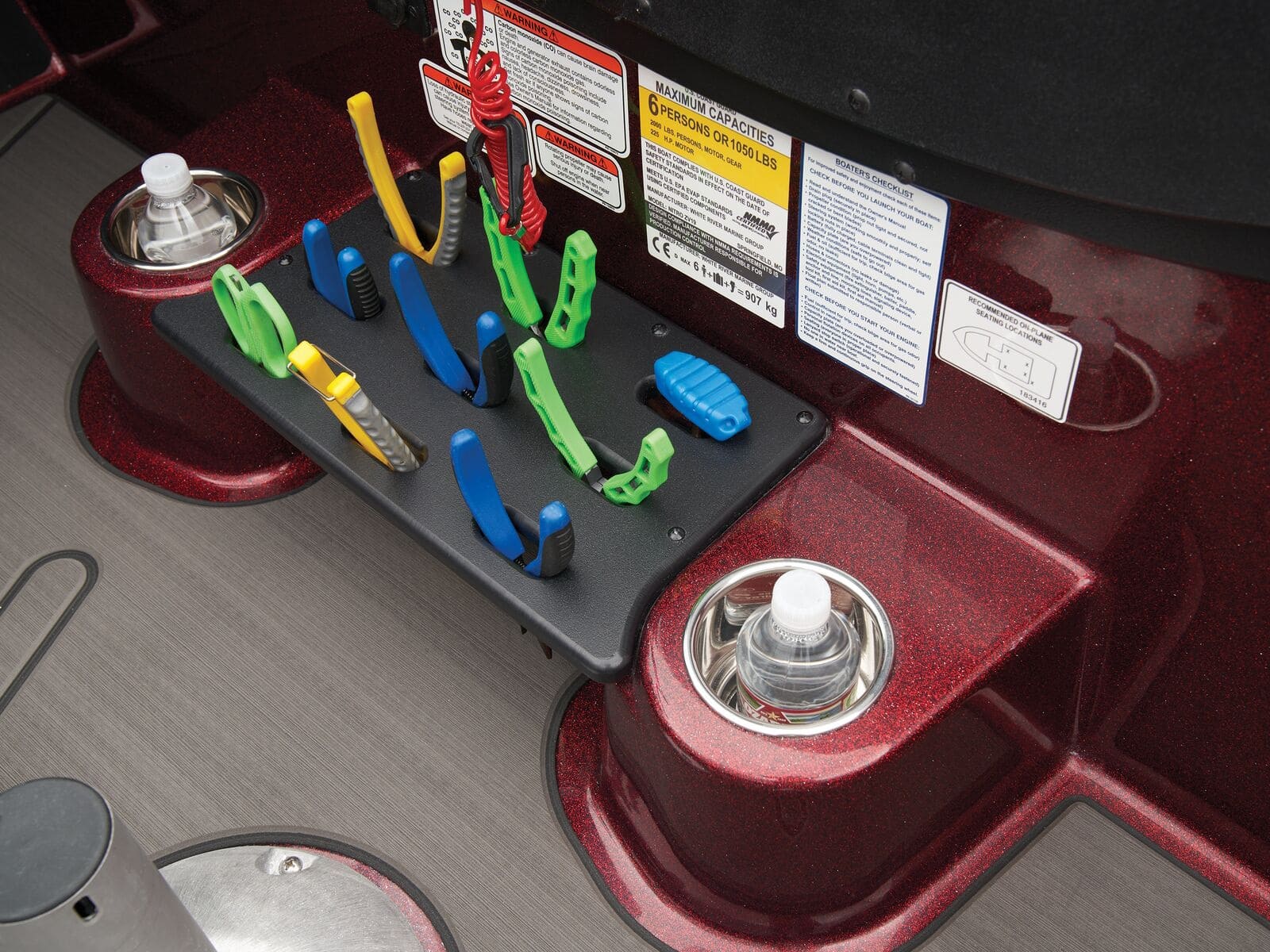 - Custom-molded port & starboard modular consoles w/2-tone gelcoat scheme