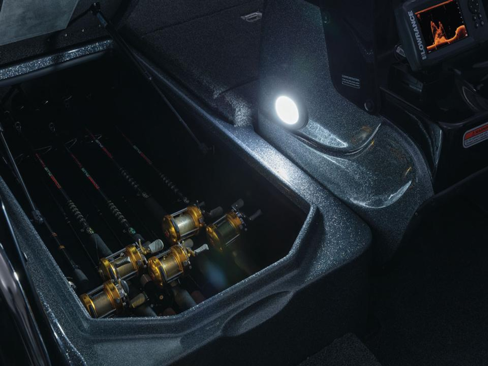 Inside, the front deck is perfect for casting and fishing with electronics thanks to its generous width. Underfoot are deep, gaskets storage boxes as well as provisions for a bait bucket and an insulated cooler. The dual-console design keeps the elements at bay and keeps your necessities on hand. A gimbal-mounted Lowrance® Eagle 5 fishfinder complements the gauge set and simple, intuitive switching at the helm.