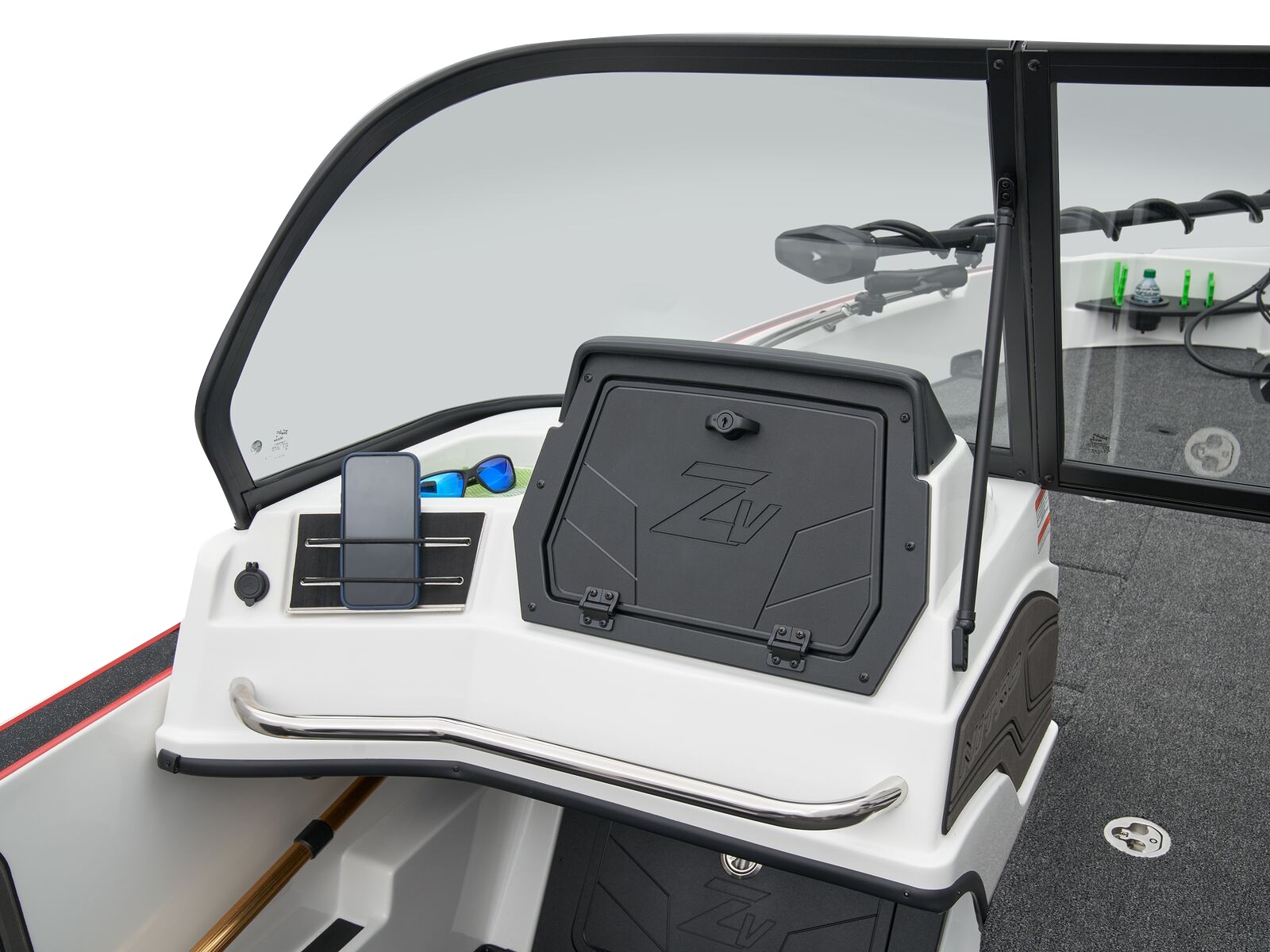 Our revamped flagship refines the standard in Deep V performance, strength, and fishability. The 2025 ZV21 is built extra tough to tame any water, and features innovative new tactically-designed gunnels, Z-touch controls and saddle storage that’ll fit up to four dozen 3700-sized utility boxes. A new console and bow panel will accept any electronics you could dream of, and the in-floor battery compartment fits up to 5 batteries and their chargers with ease. Up front is a RAM-mounted 12” Garmin ECHOMAP Ultra w/LiveScope Plus. And at the console is a Garmin ECHOMAP Ultra 12”. A Garmin Force Kraken 36V, 100-lb. thrust trolling motor delivers stealthy power and easy control.