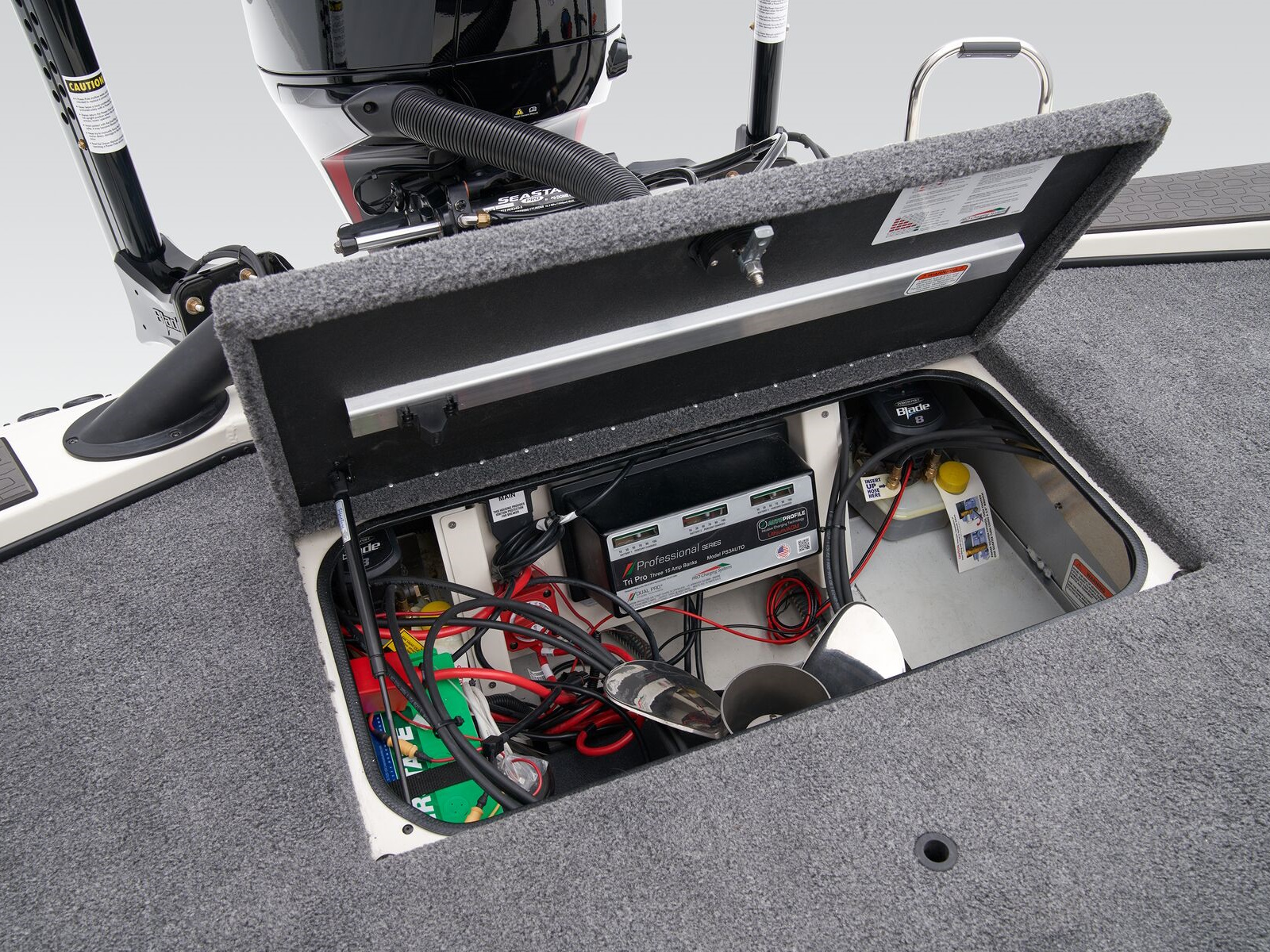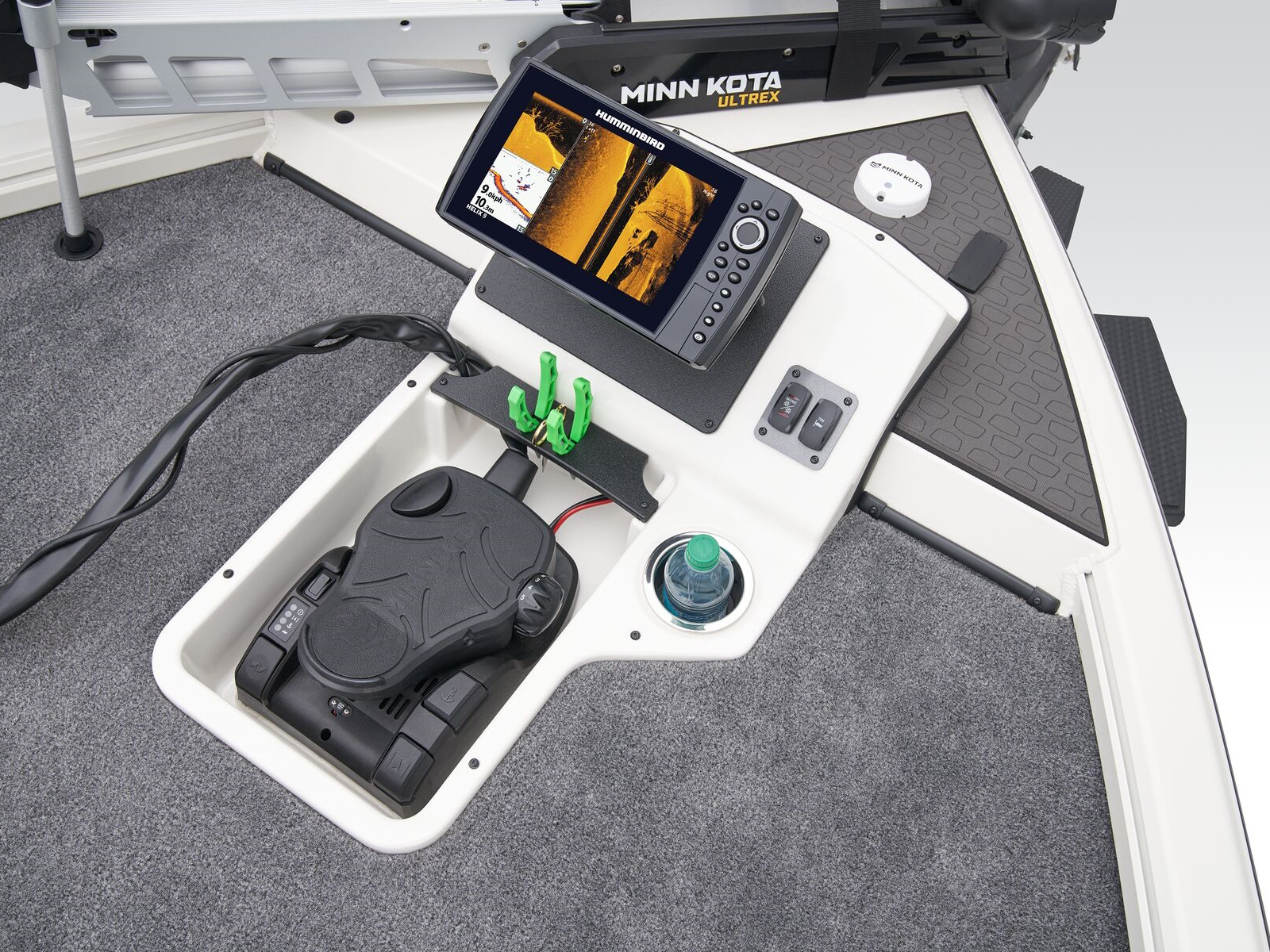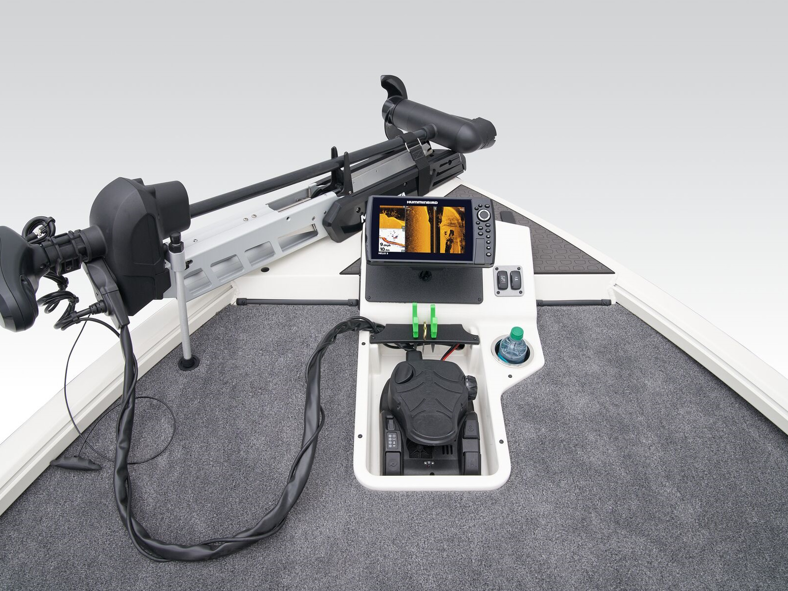 - Custom fiberglass console w/ flush-mounted depthfinder & easy touch switching