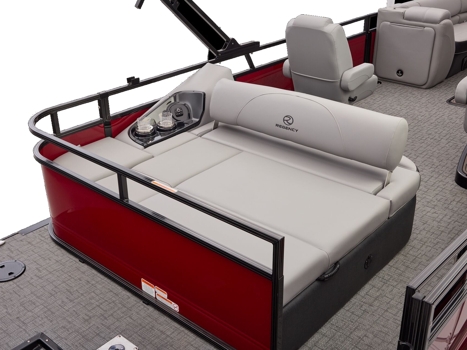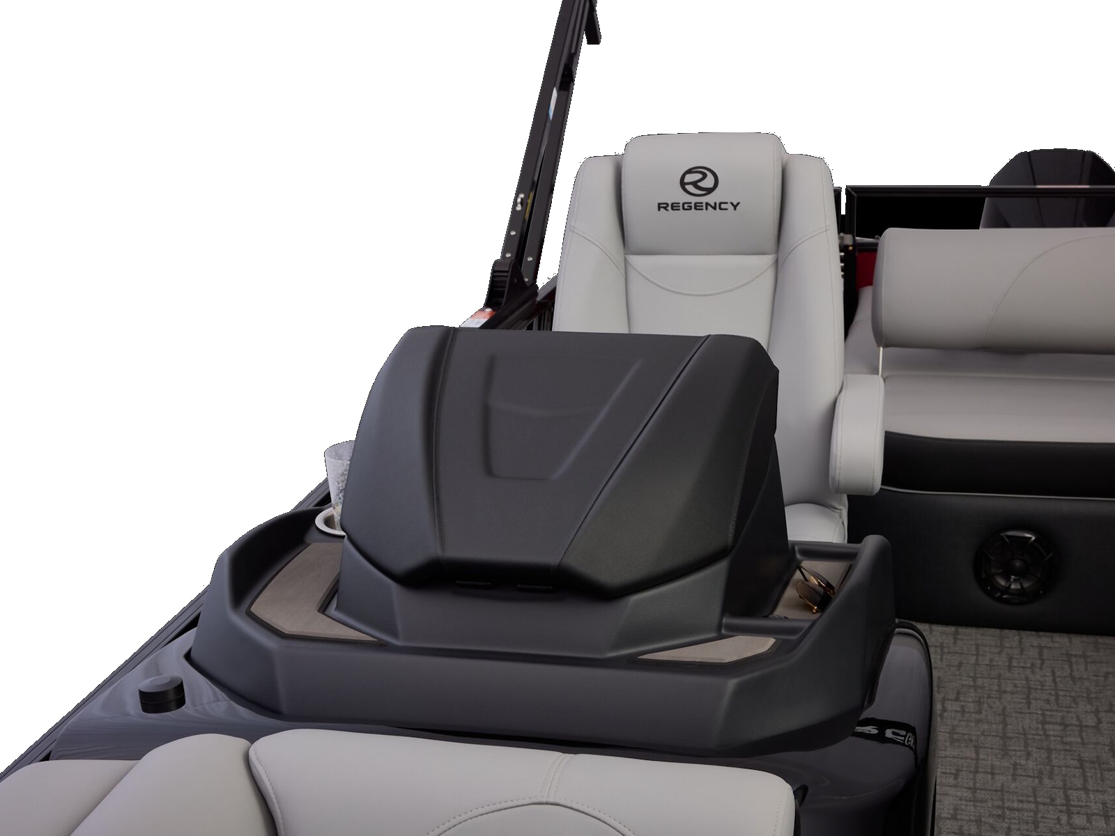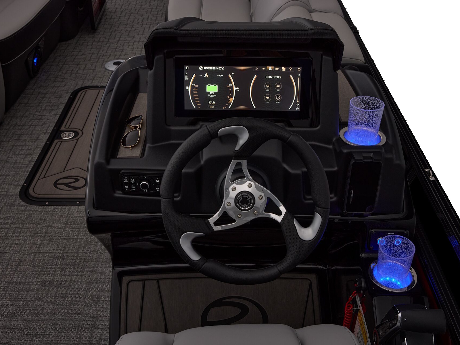 At the raised helm, take control with the REGENCY® omni2™ 12" touchscreen, Bluetooth® integration, Wet Sounds® audio, and Scanstrut® wireless charging. USB A/C ports at every seat keep devices powered, and a powered Bimini top plus integrated bow and aft cameras add convenience and confidence.