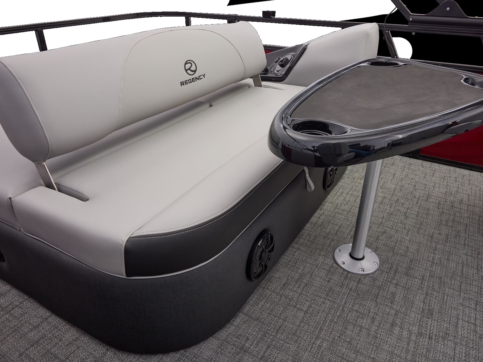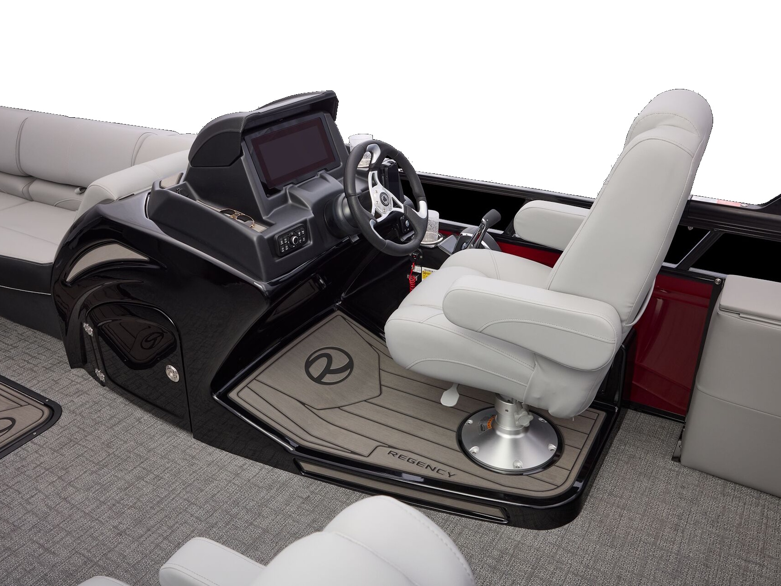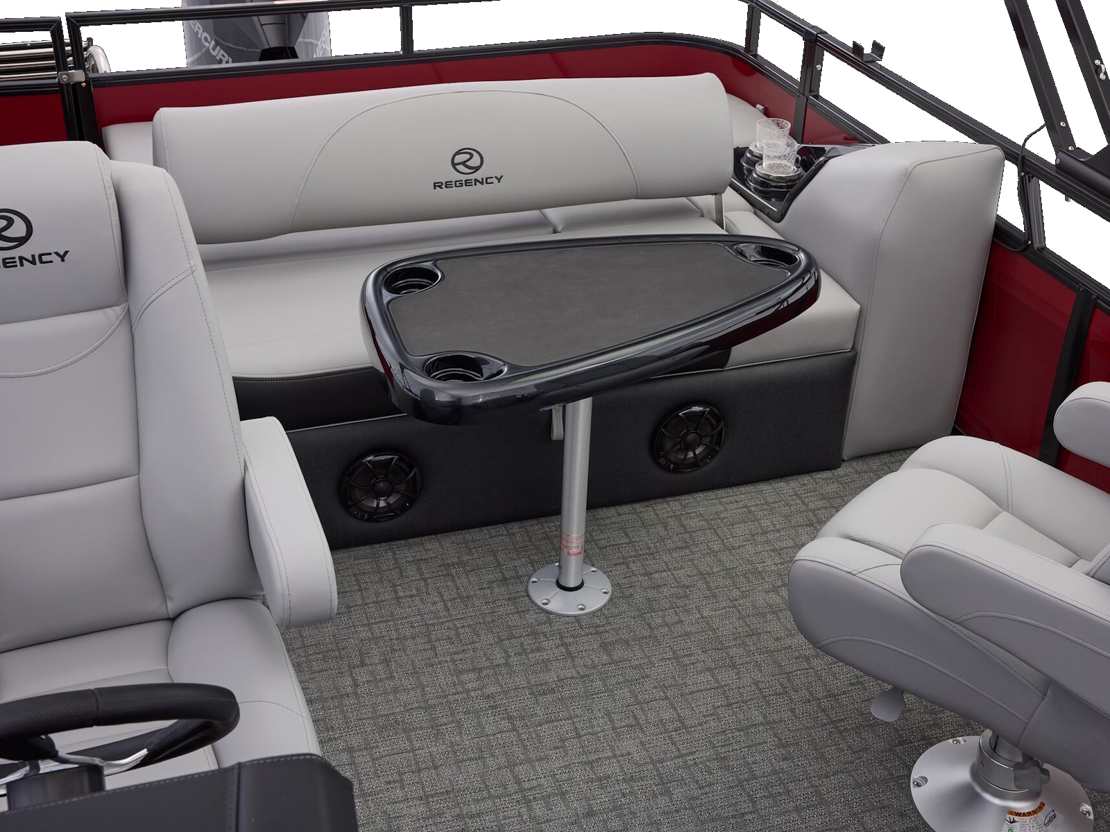At the raised helm, take control with the REGENCY® omni2™ 12" touchscreen, Bluetooth® integration, Wet Sounds® audio, and Scanstrut® wireless charging. USB A/C ports at every seat keep devices powered, and a powered Bimini top plus integrated bow and aft cameras add convenience and confidence.