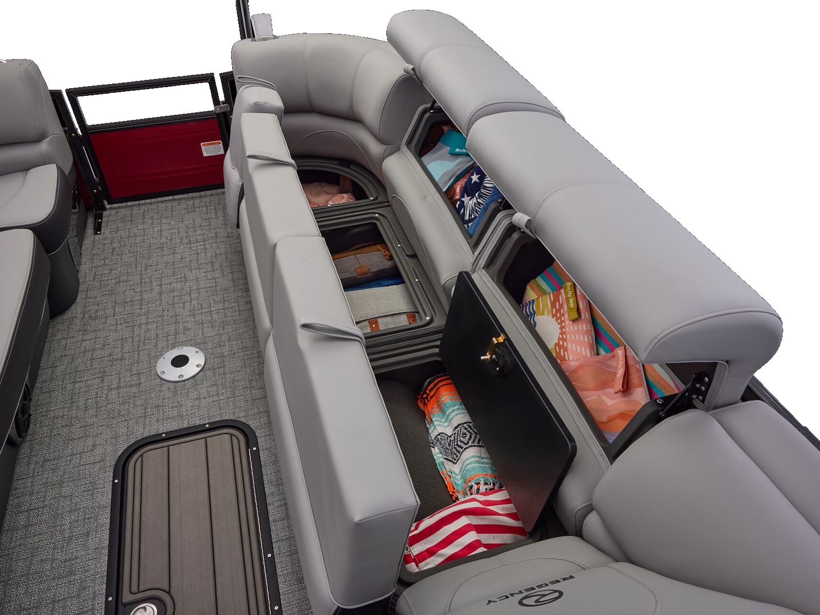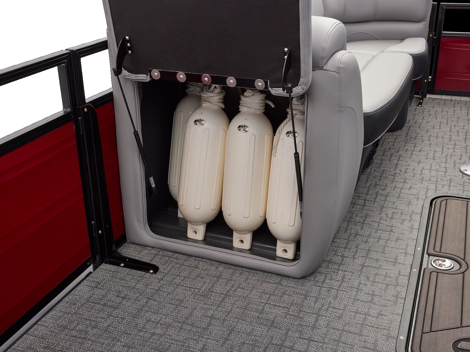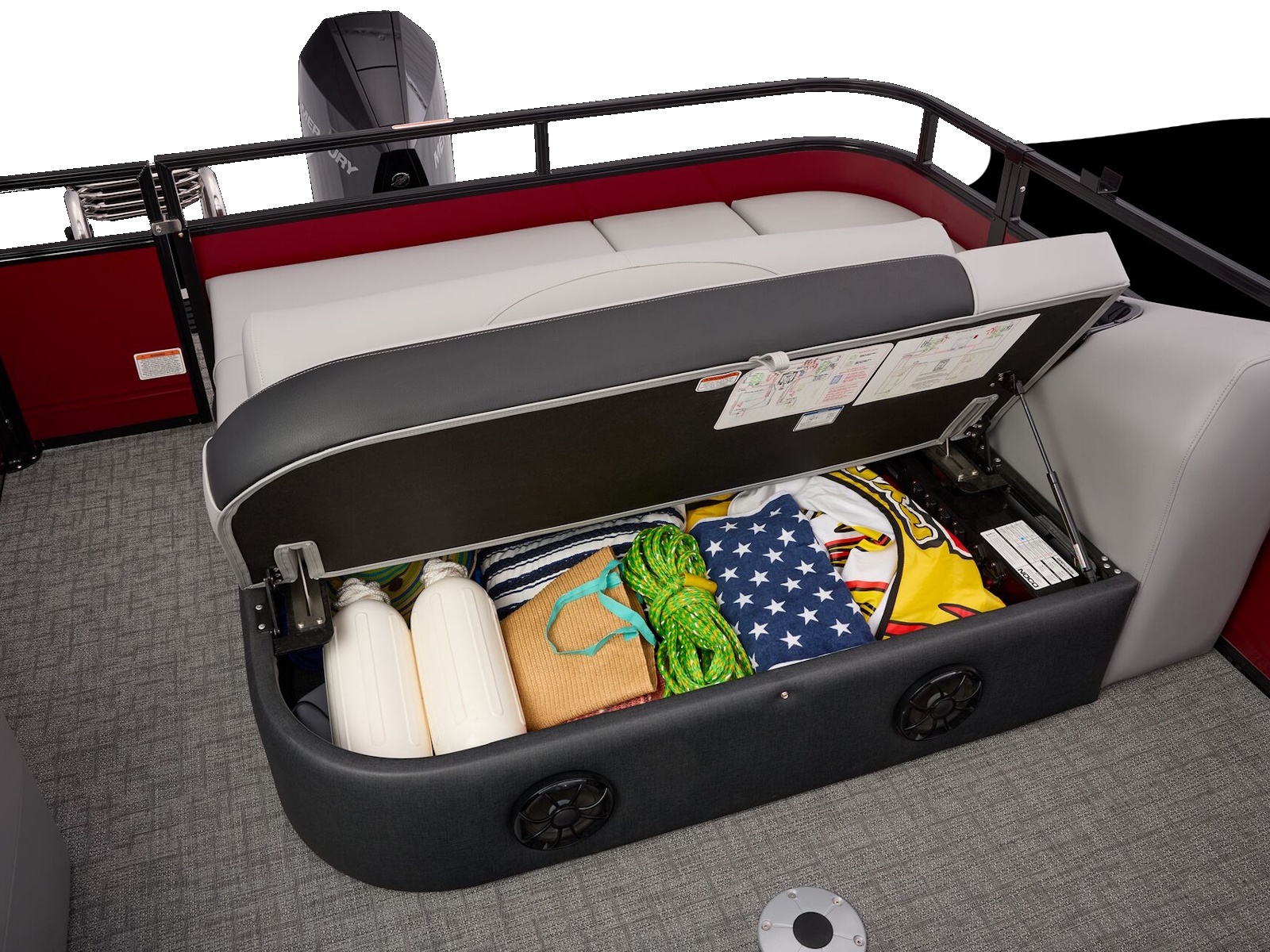 - Wraparound bow port & starboard lounges w/extra-deep cushions, pillowtop backs, lumbar support & lockable storage