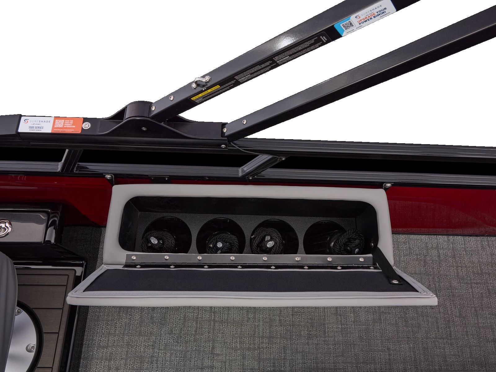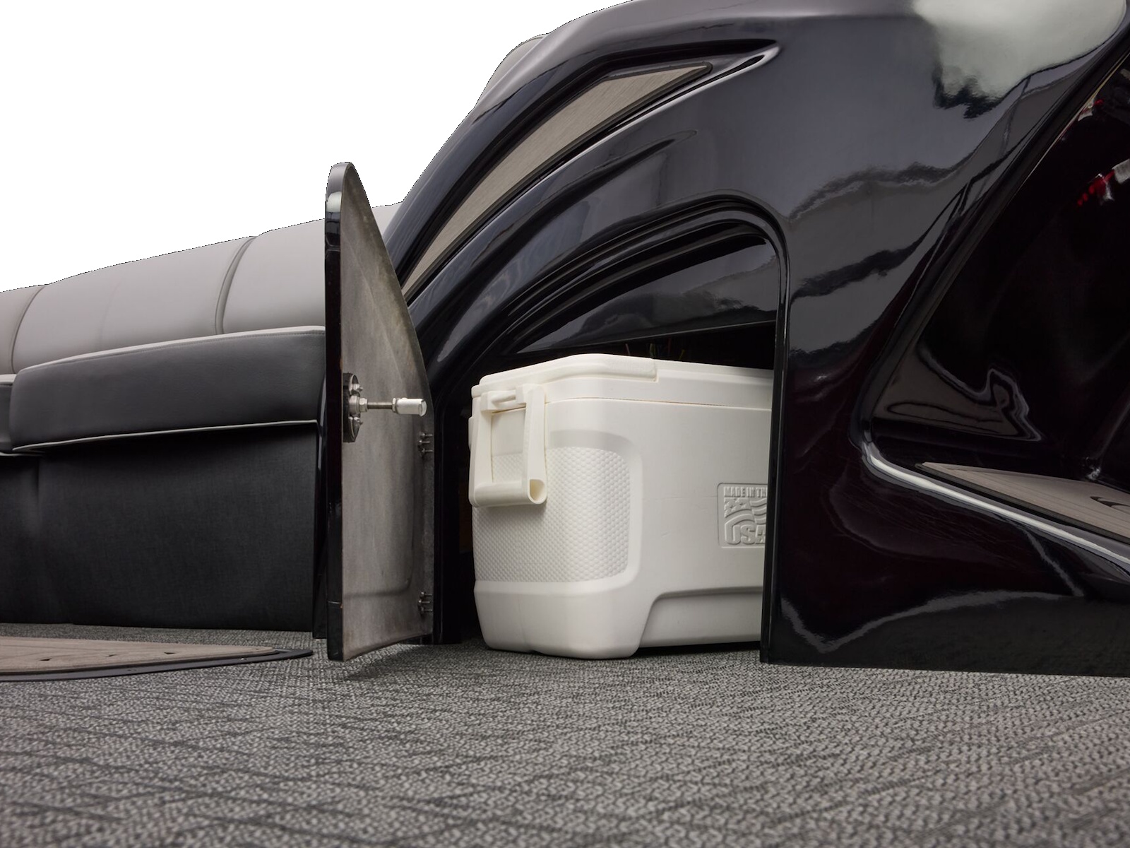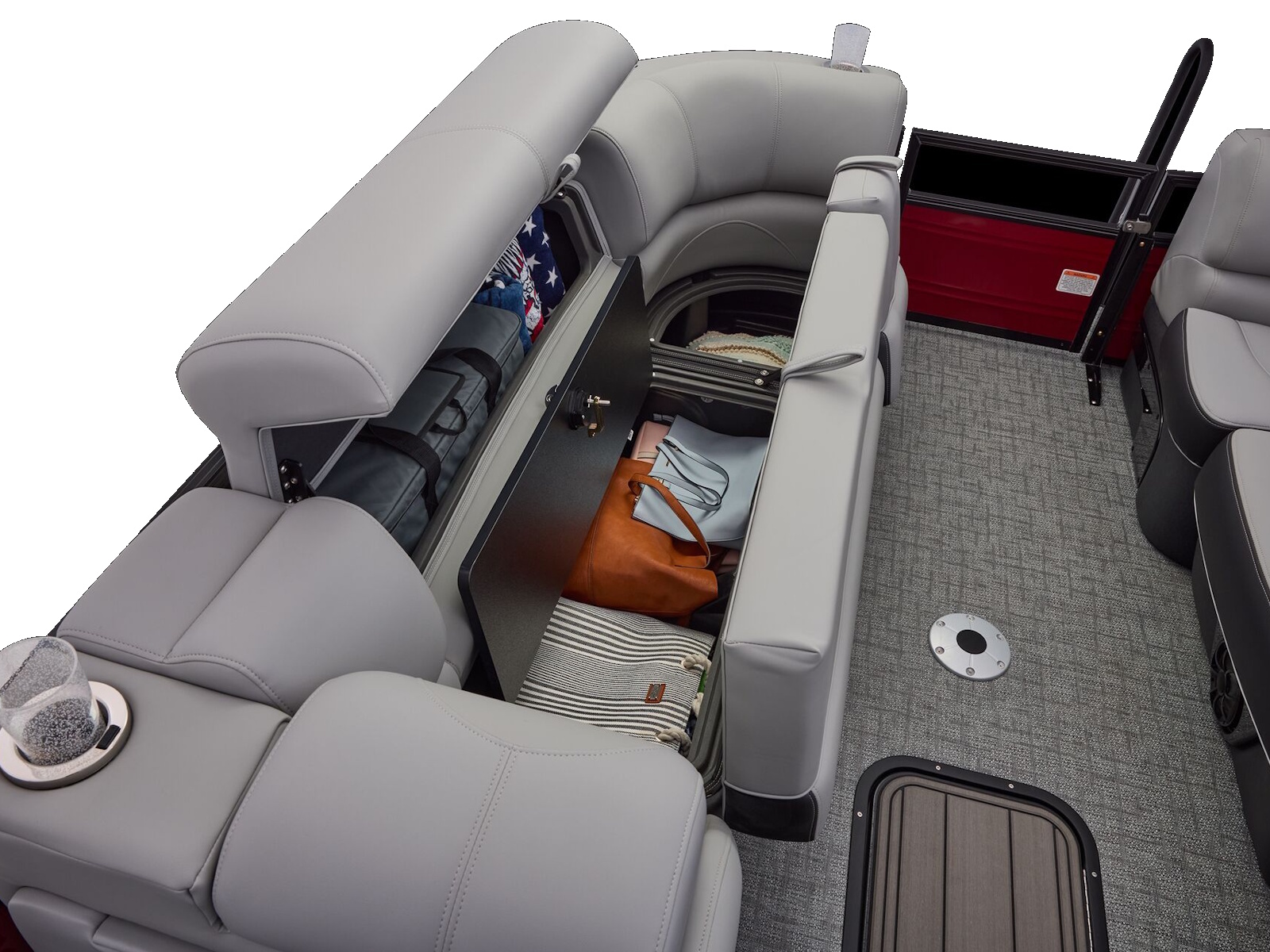 - Wraparound bow port & starboard lounges w/extra-deep cushions, pillowtop backs, lumbar support & lockable storage
