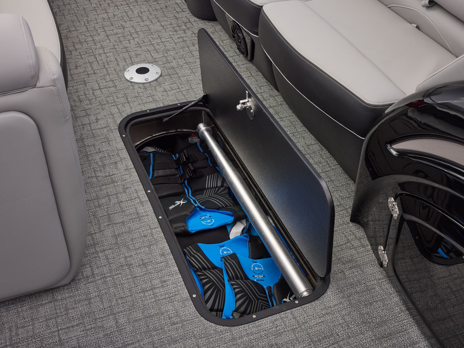 - Removable tournament-style ski tow pylon w/NEW dedicated in-floor storage system