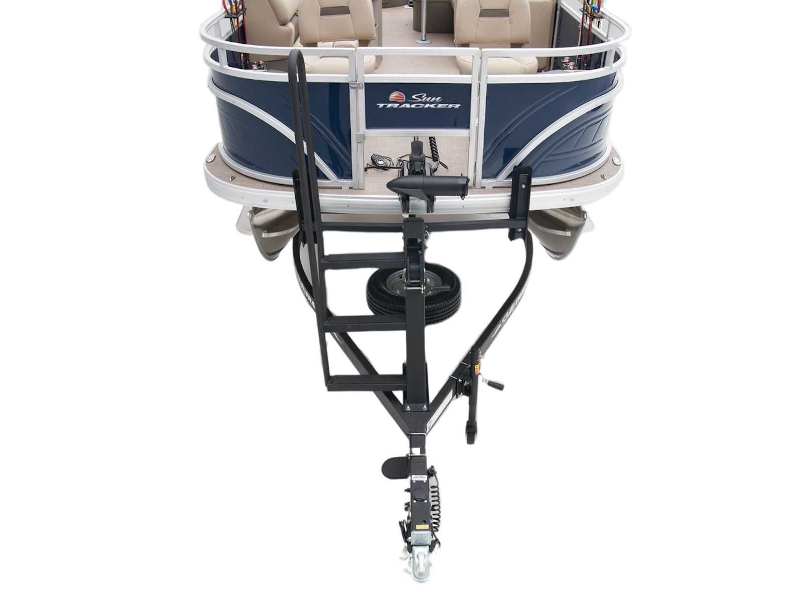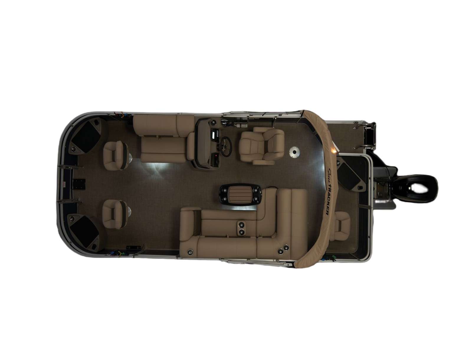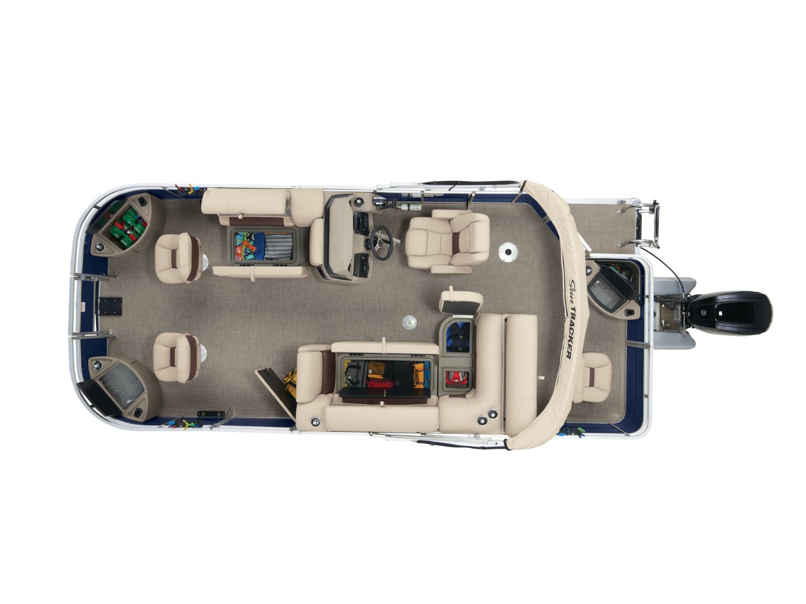 - 9' (2.74 m) SUN TRACKER® QuickLift™ Bimini top w/LED courtesy lights, storage pockets & protective boot (color-coordinated Black w/Charcoal fencing or Sand w/Indigo Blue fencing)