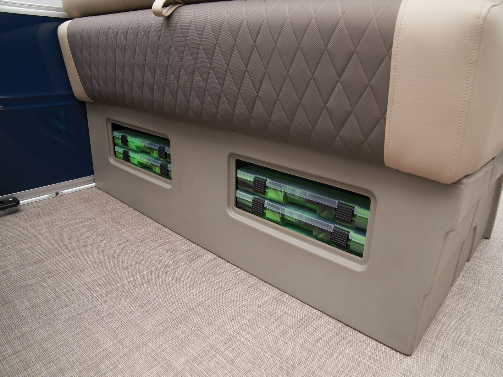 - Aft L-lounge couches w/STOW MORE™ & underseat, lockable storage