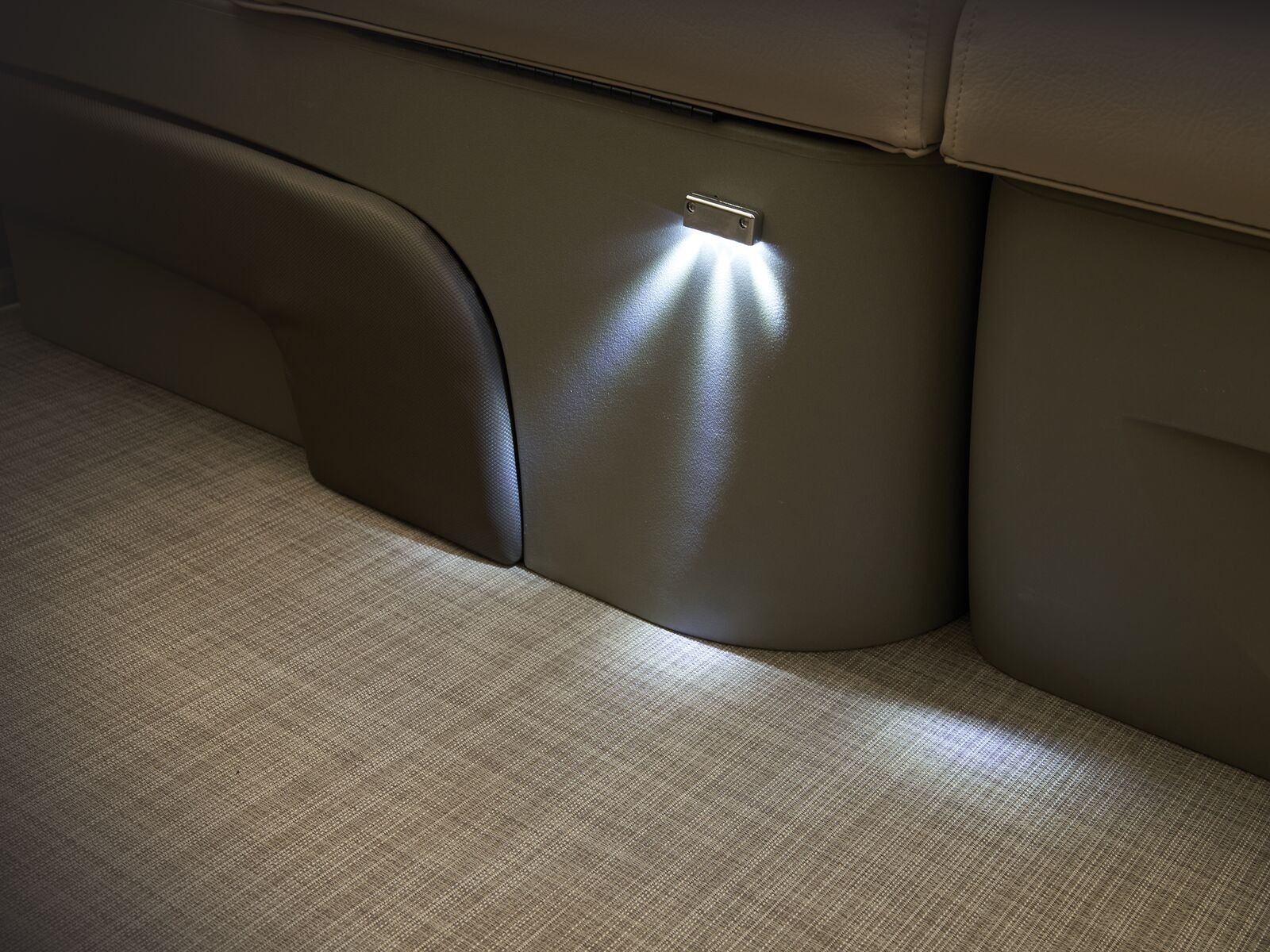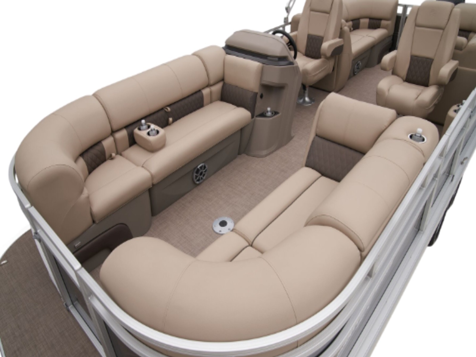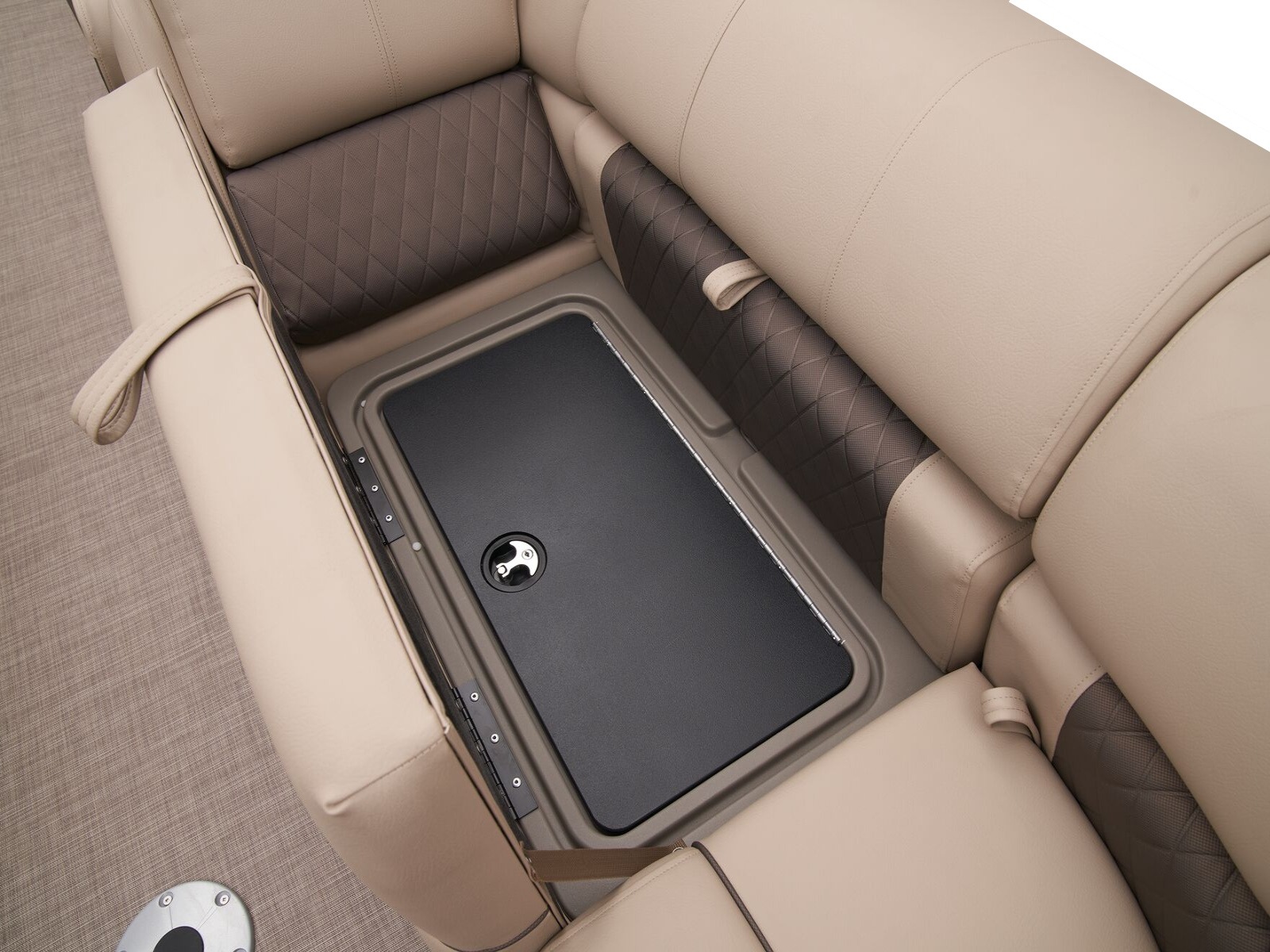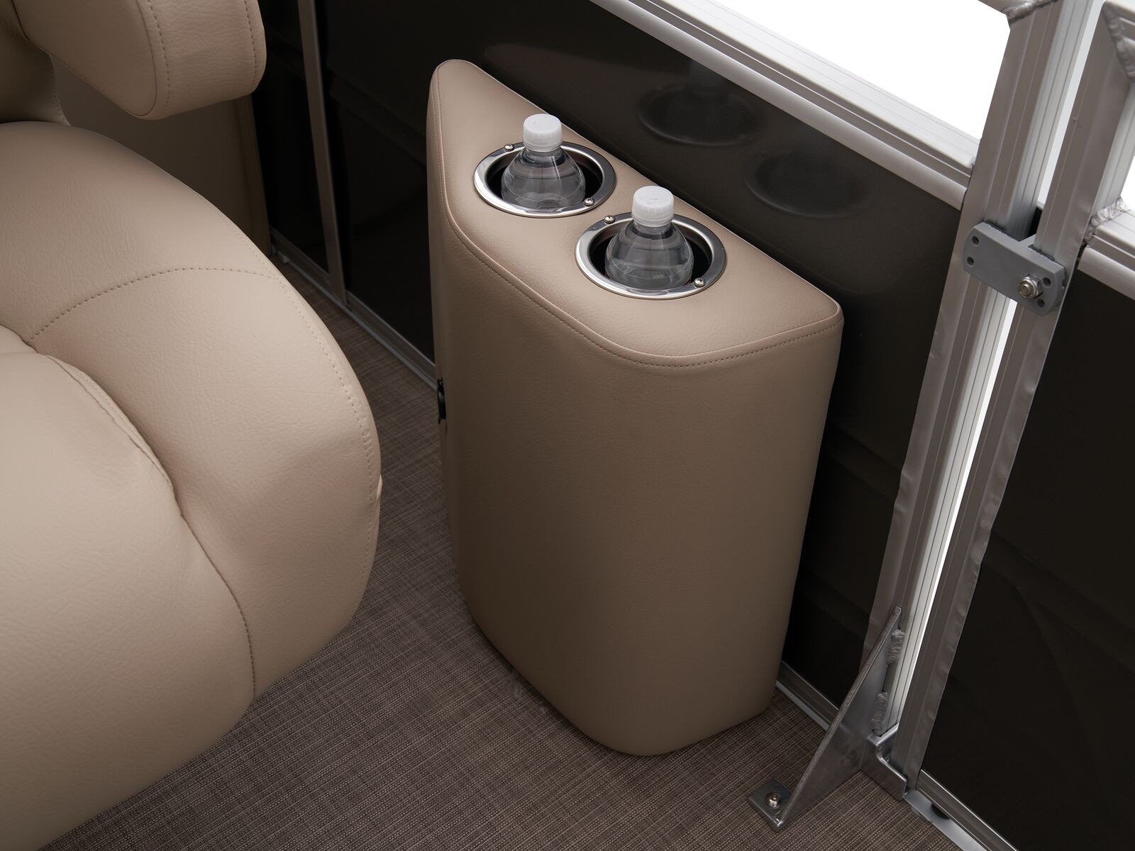 This deluxe pontoon boat provides you with an amazing amount of storage under each lounge's seat, behind their seat backs, and under the console. A removable table with 4 molded-in drink holders can be placed at 1 of 2 anchor points. Pump up the jams with the standard Wet Sounds® stereo system with 4 speakers embedded in the upholstery.
