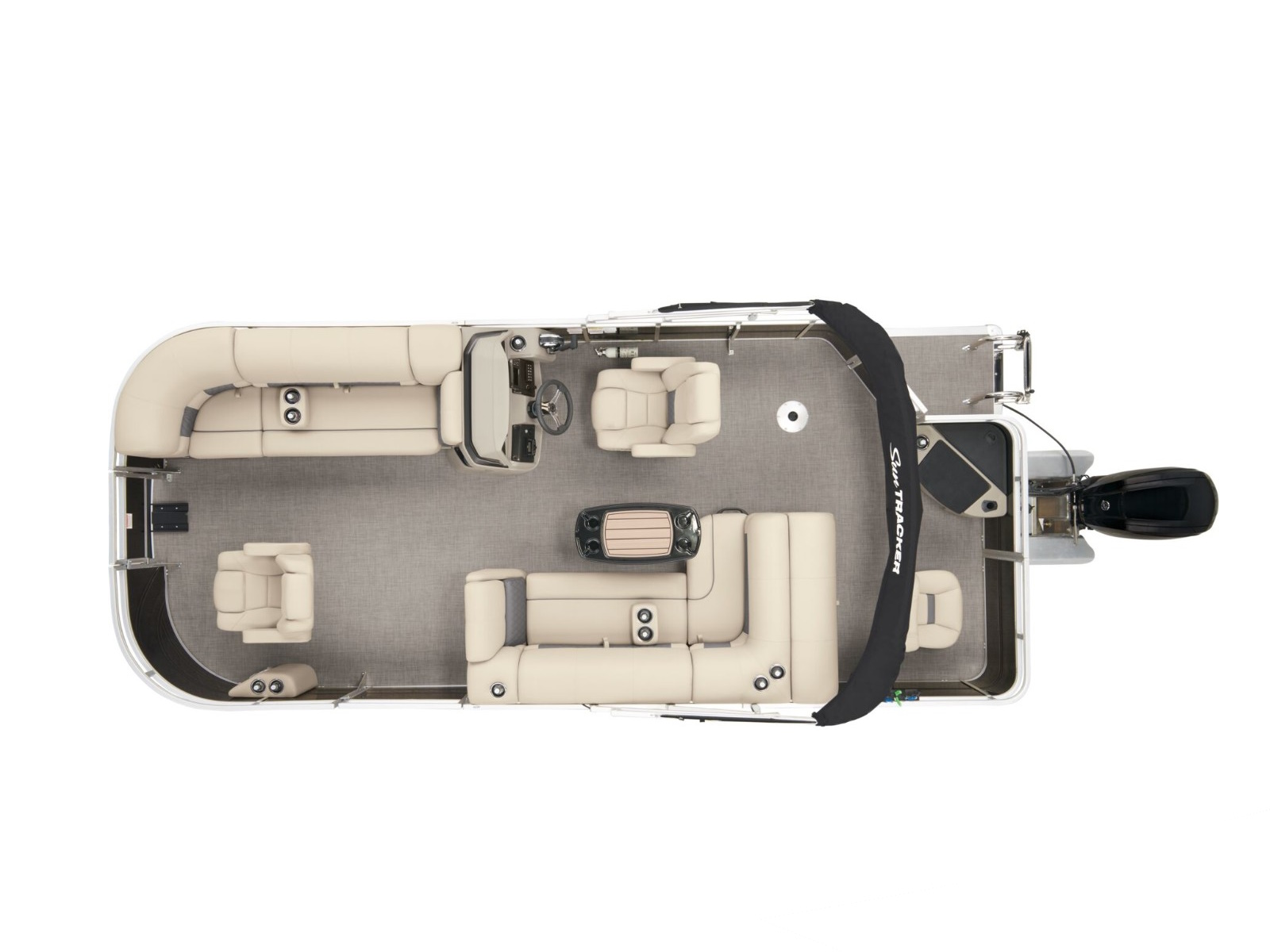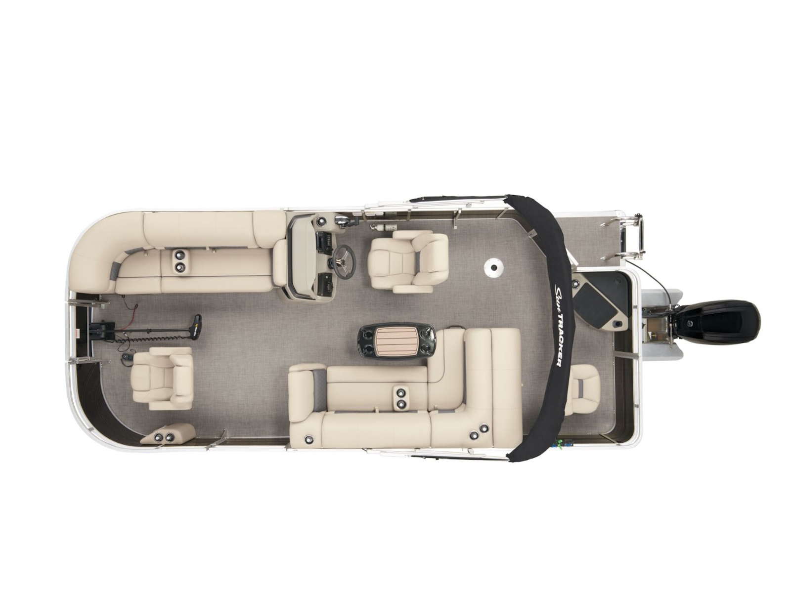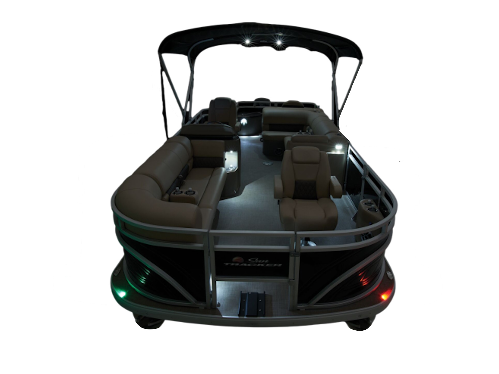 - 9' (2.74 m) SUN TRACKER® QuickLift™ Bimini top w/LED courtesy lights, storage pockets & protective boot (color-coordinated Black w/Black fencing or Sand w/Caribou fencing)