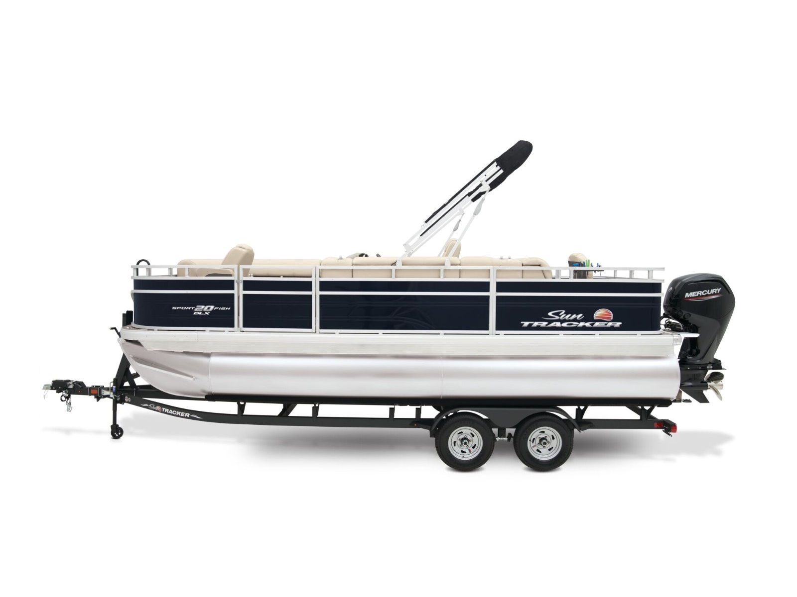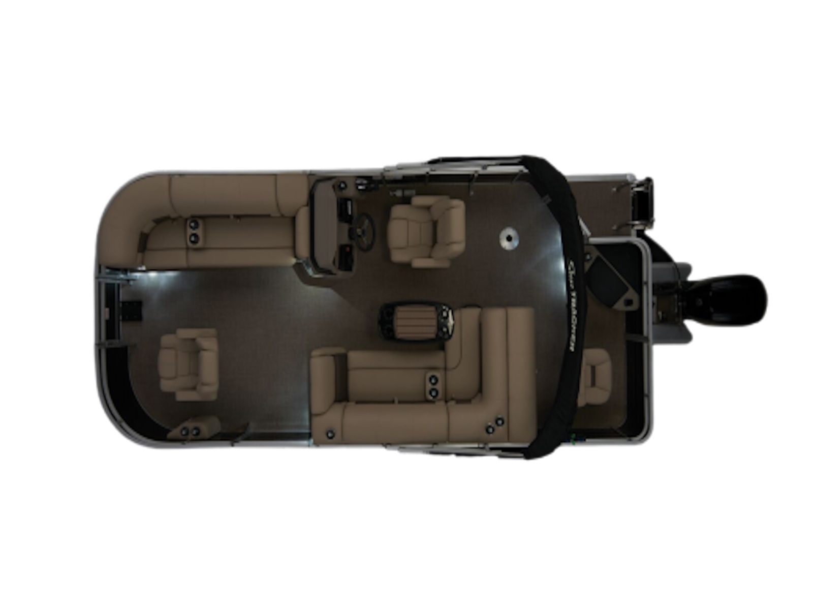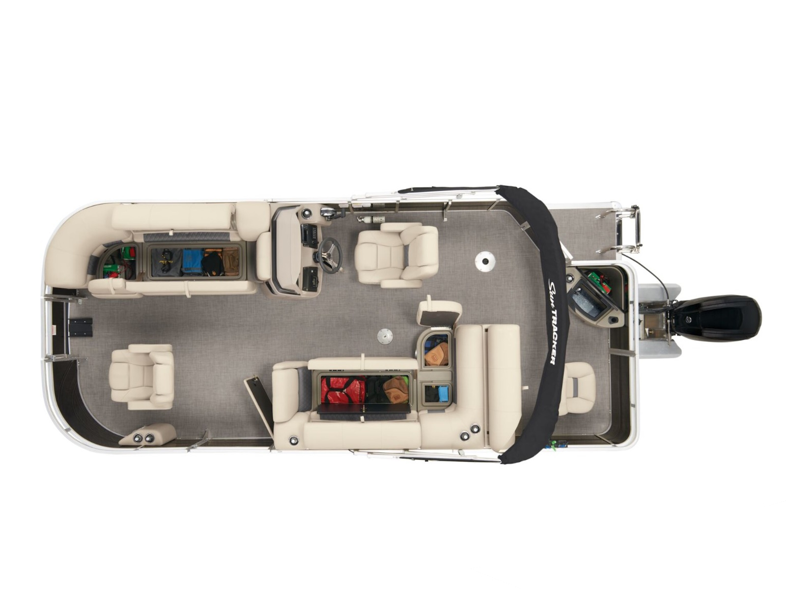 - 9' (2.74 m) SUN TRACKER® QuickLift™ Bimini top w/LED courtesy lights, storage pockets & protective boot (color-coordinated Black w/Black fencing or Sand w/Caribou fencing)