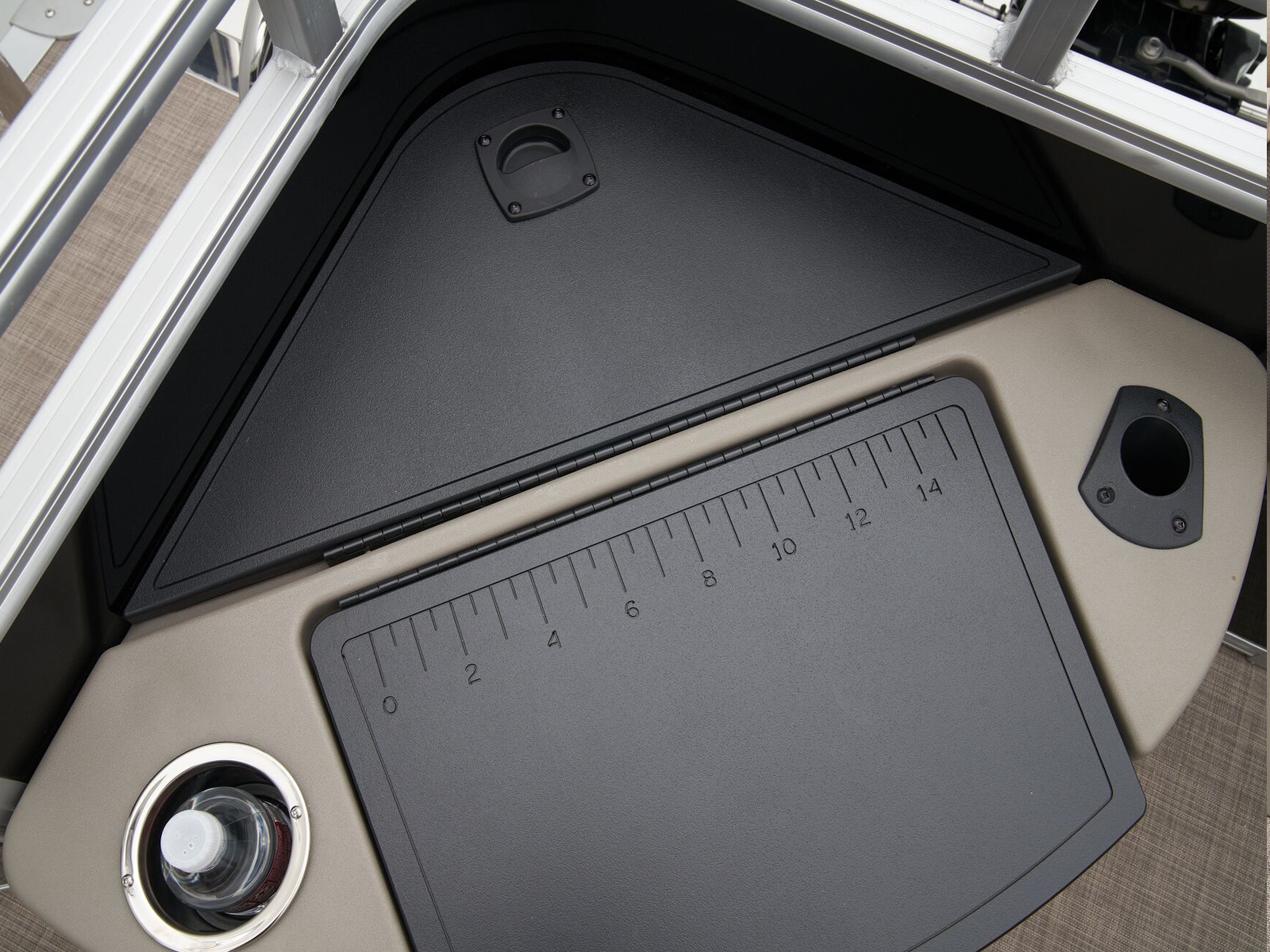 - Aft 8-gal. (30.28 L) aerated livewell/baitwell w/shutoff valve, drink holder, rod holder & composite lid w/fish ruler}