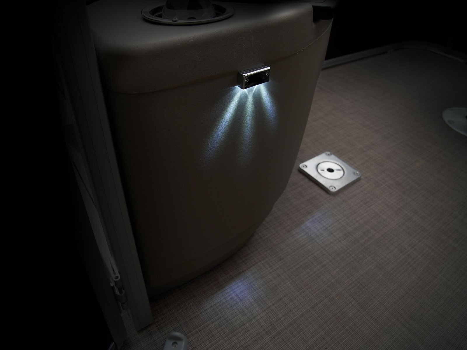 - Aft fishing station w/2 pedestal seat bases; rail-mounted rod & tool holders; STOW MORE™ tackle storage station; & rear-facing tackle storage