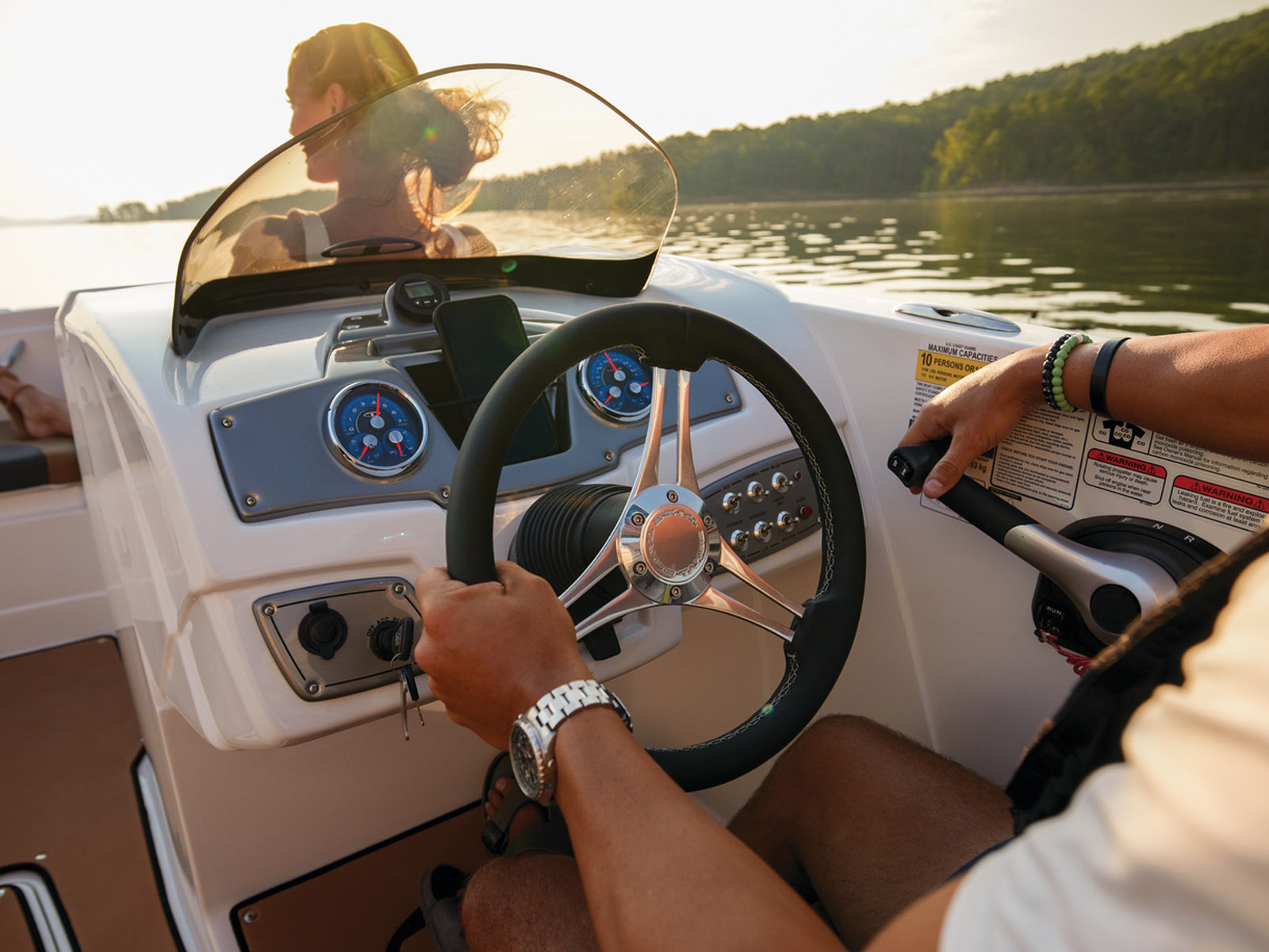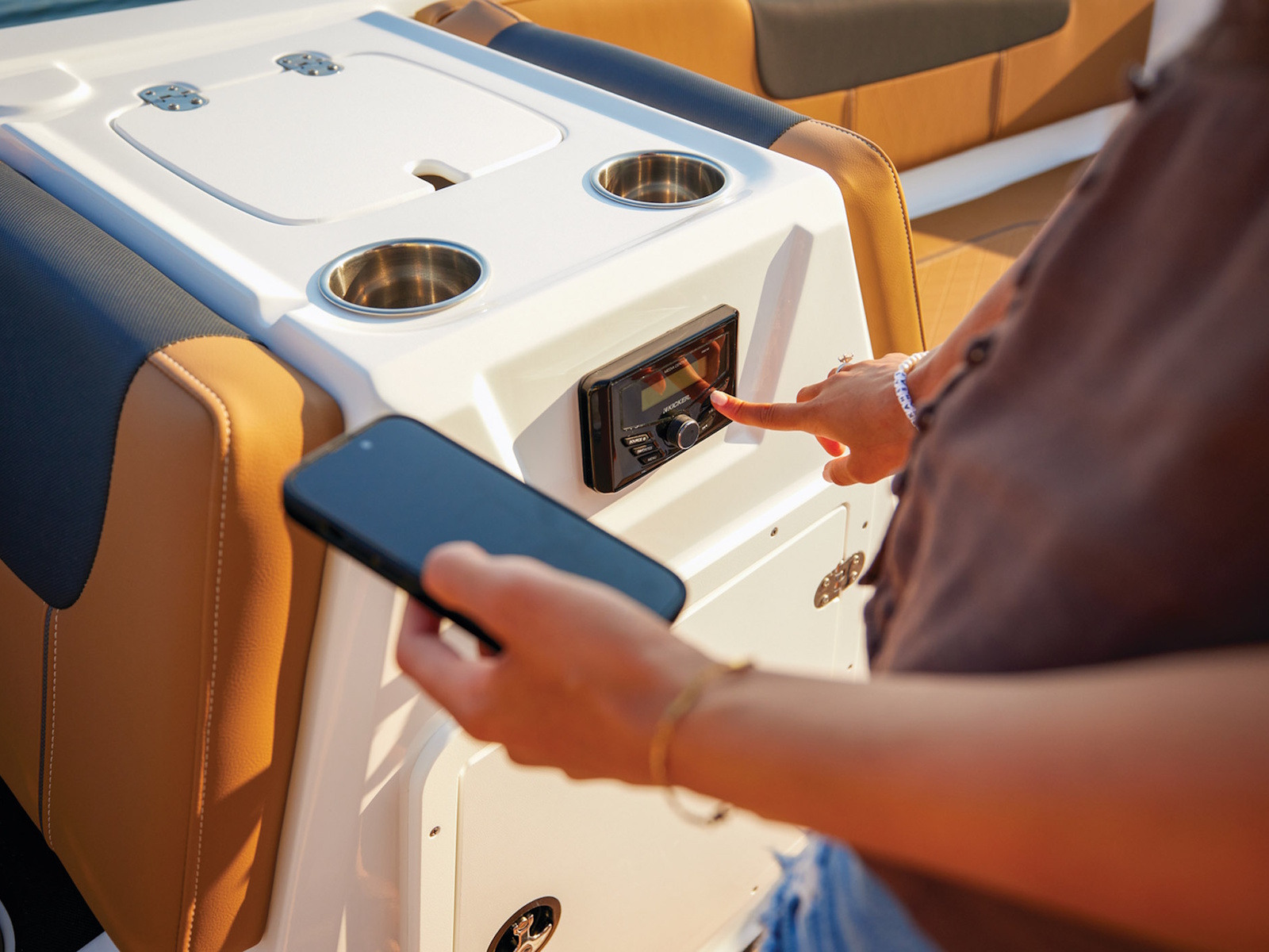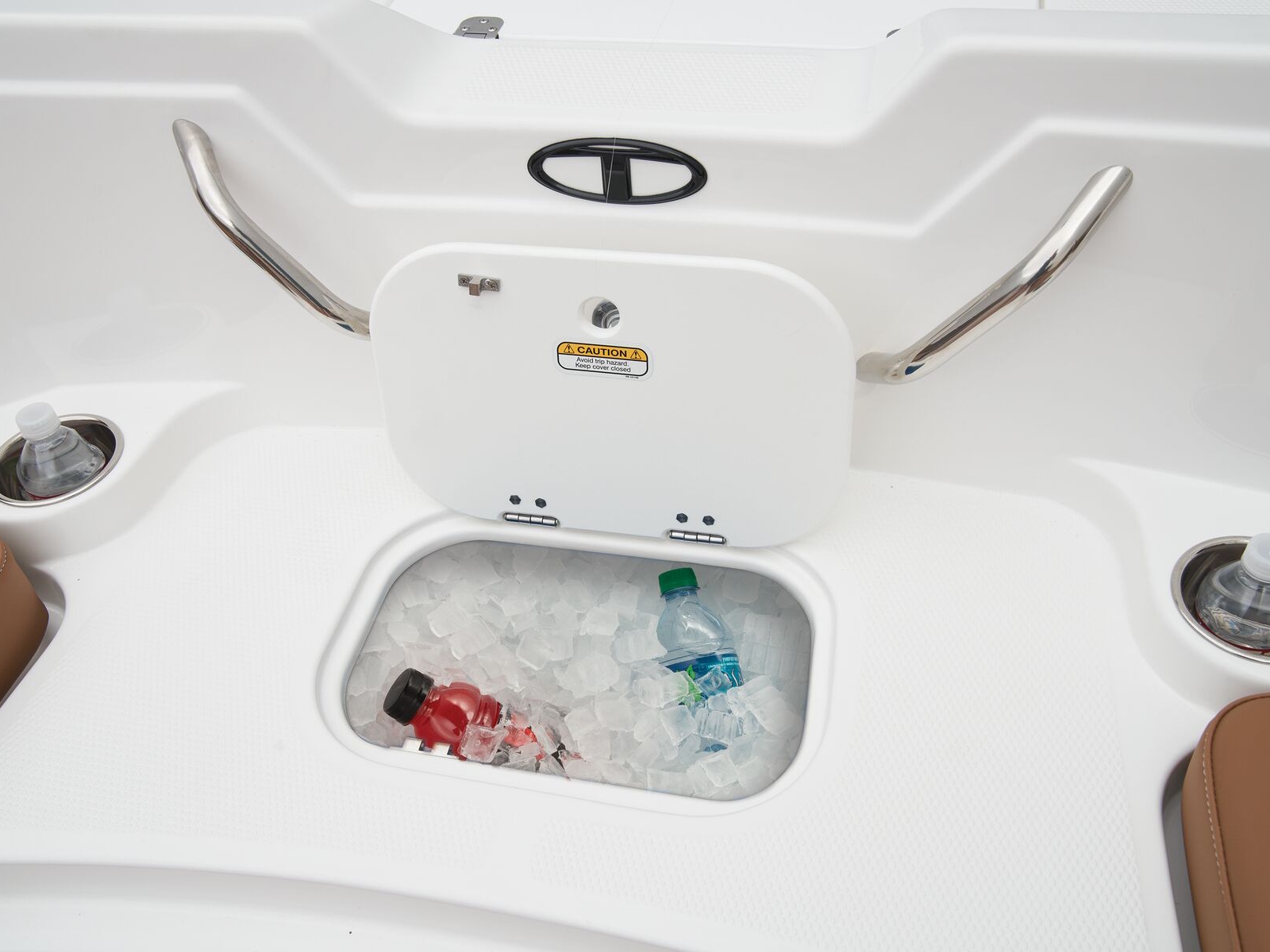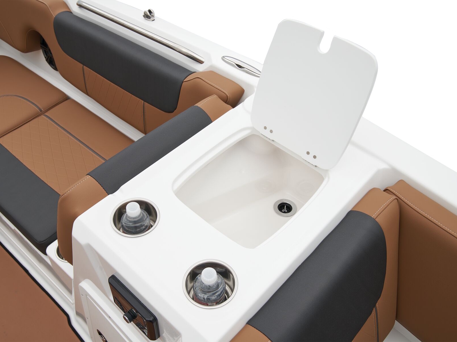 The ample lounges and benches hold a crew of 10. Stow gear, supplies, and more in the hidden storage compartments under the seats and elsewhere. Keep the drinks and snacks cold in the removable 25-qt. cooler. A standard bimini top helps you cool off when the sun is high. This model's removable aluminum ski-tow pylon and in-floor wakeboard/ski storage makes preparing for watersports a snap.