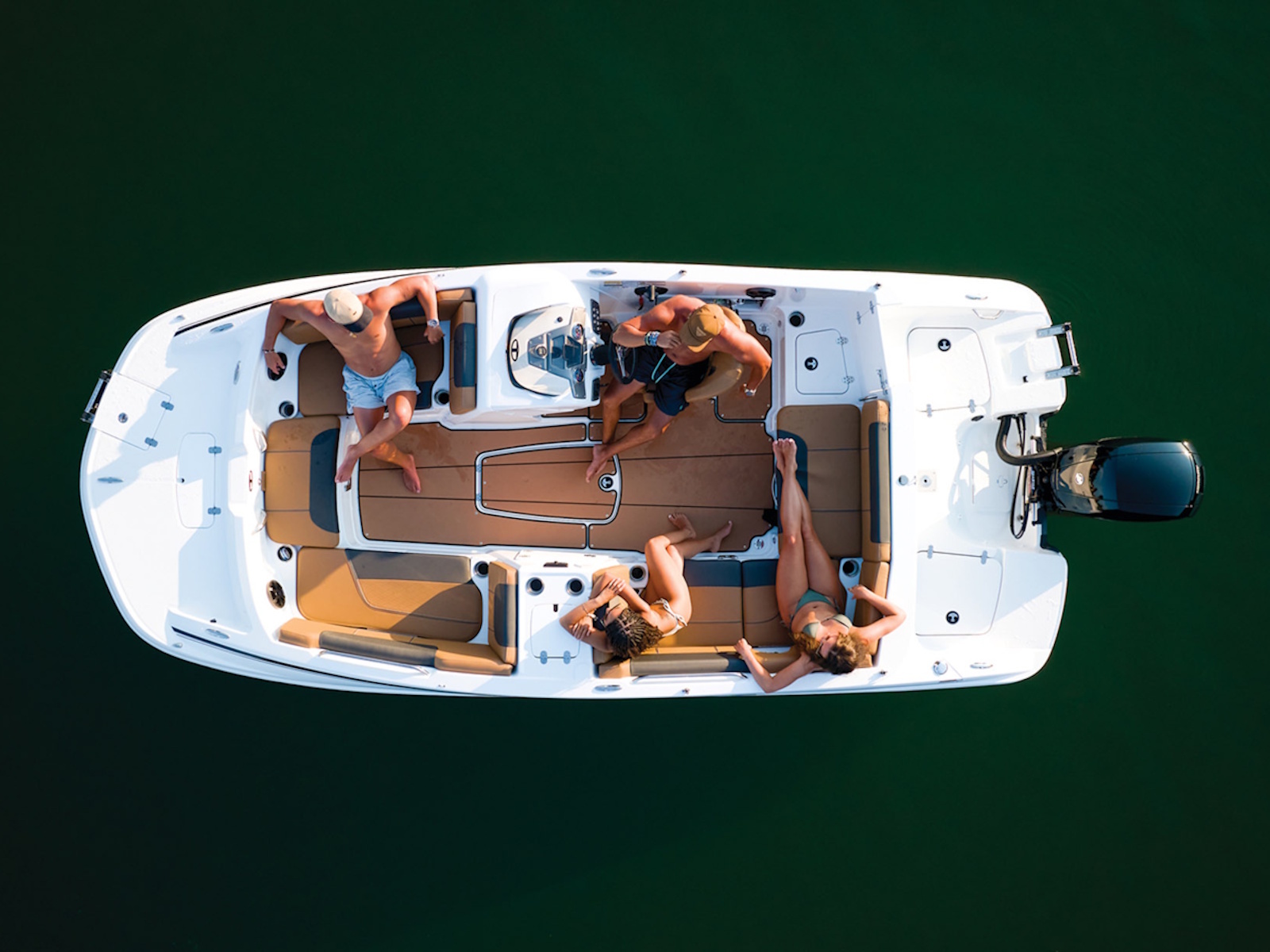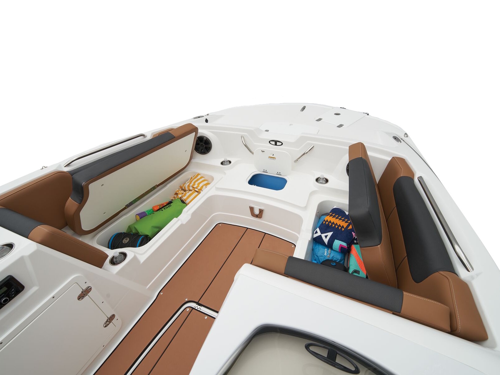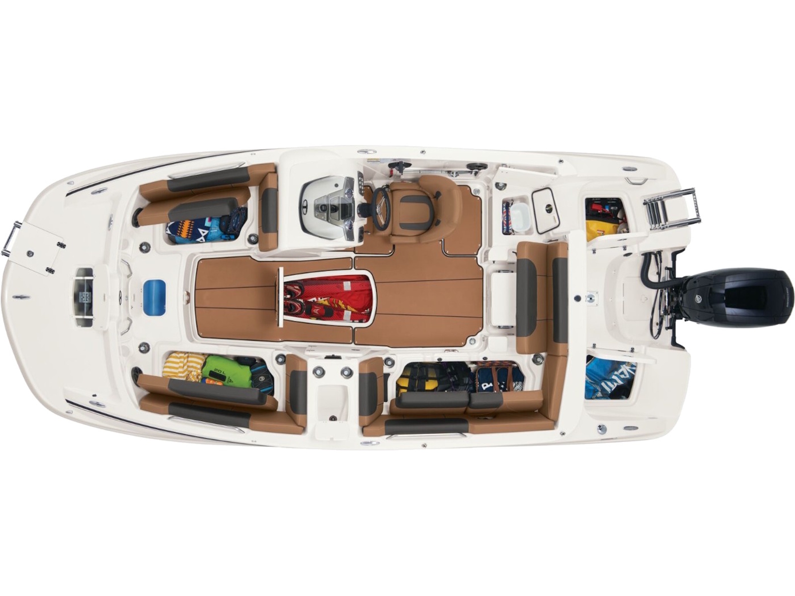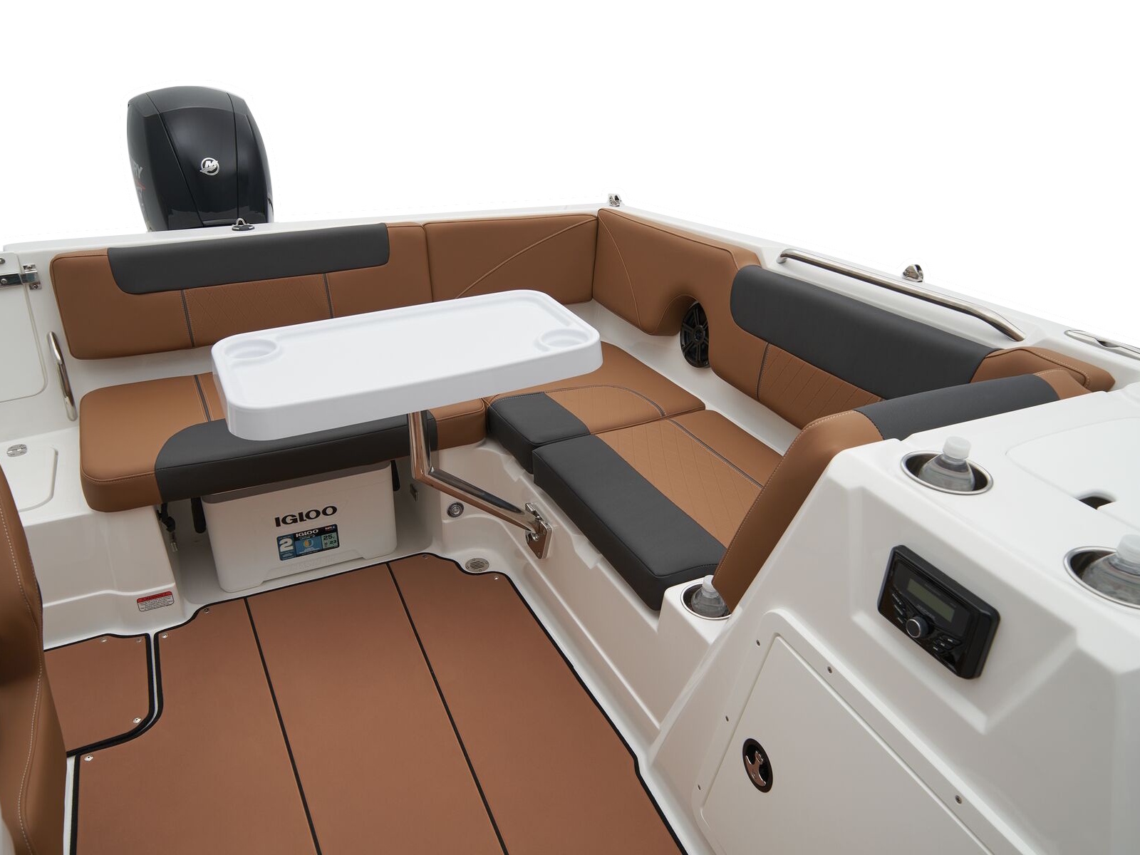 - Aft L-lounge w/storage, tow rope holder & removable 25-qt. (23.66 L) cooler
