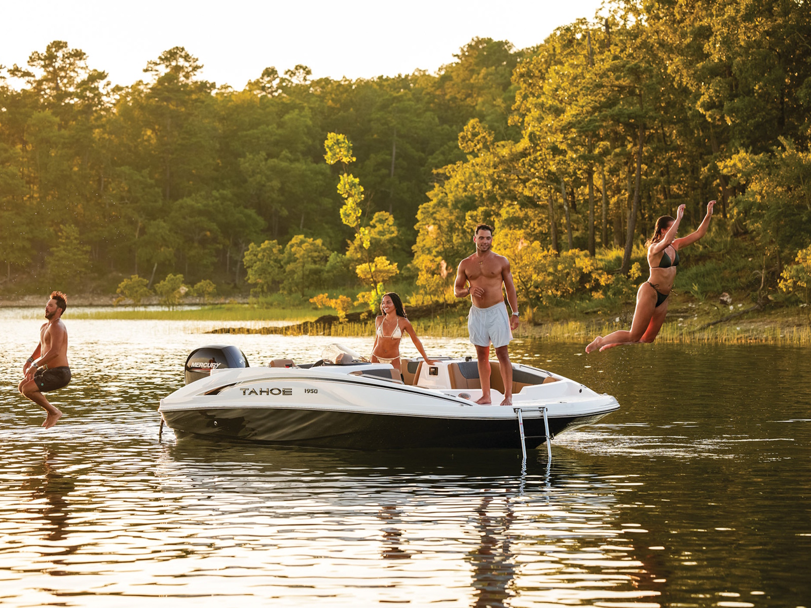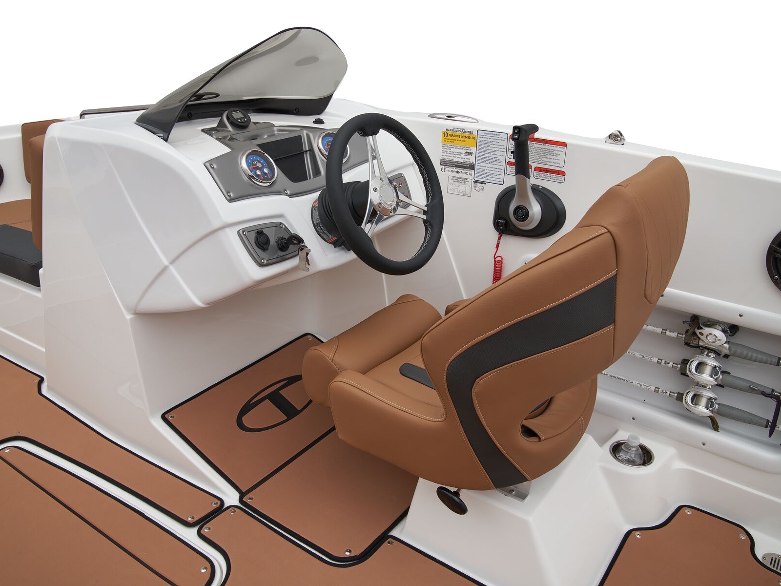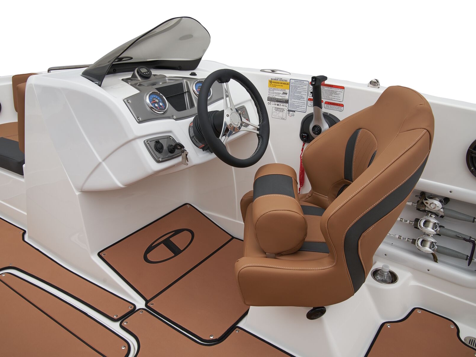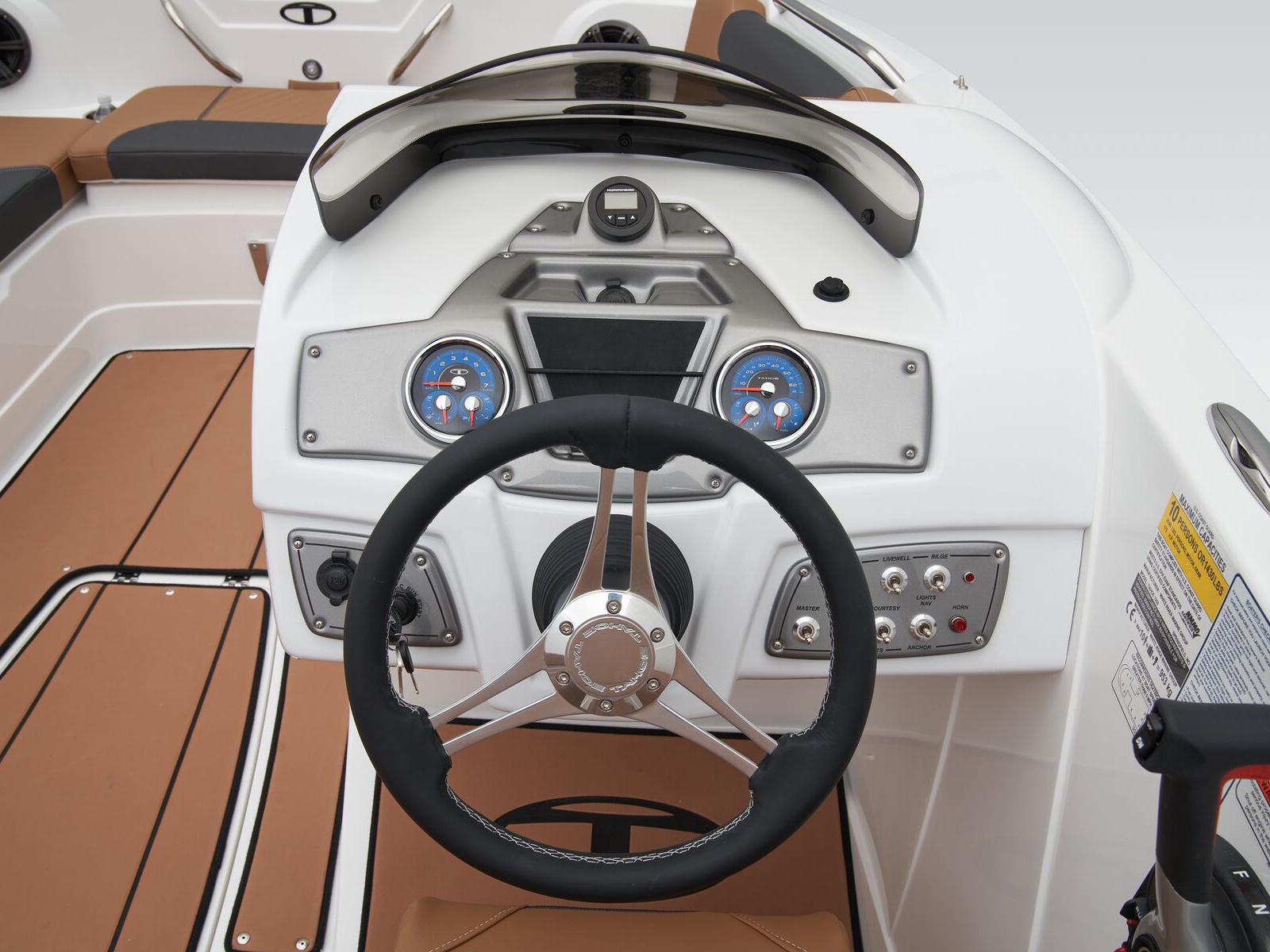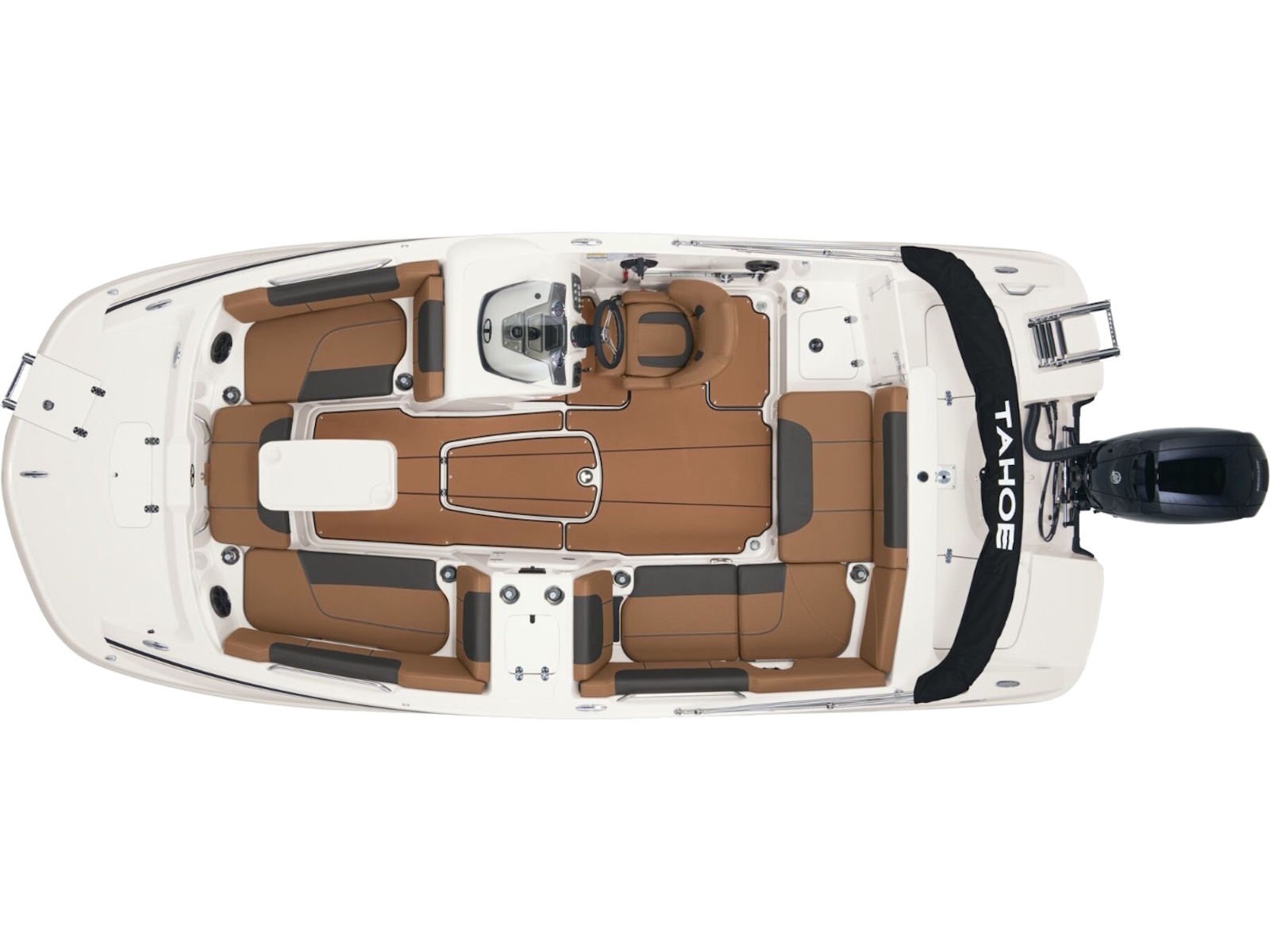 The helm boasts traditional gauges and switches for a more hands-on pilot experience. This TAHOE® is always ready to cast a line with its in-gunnel rod storage, standard 11.5-gal. livewell, and large swim platforms that can be upgraded with fishing seats. If the bites are slowing down, bring up the party playlist on the 4-speaker, Bluetooth®-compatible Kicker® stereo. After cooling off in the water, reboard with ease thanks to swim ladders at either end of the boat.
