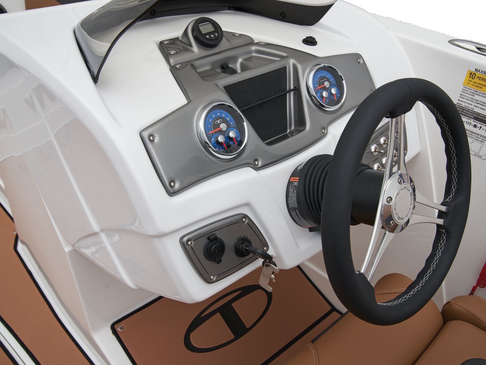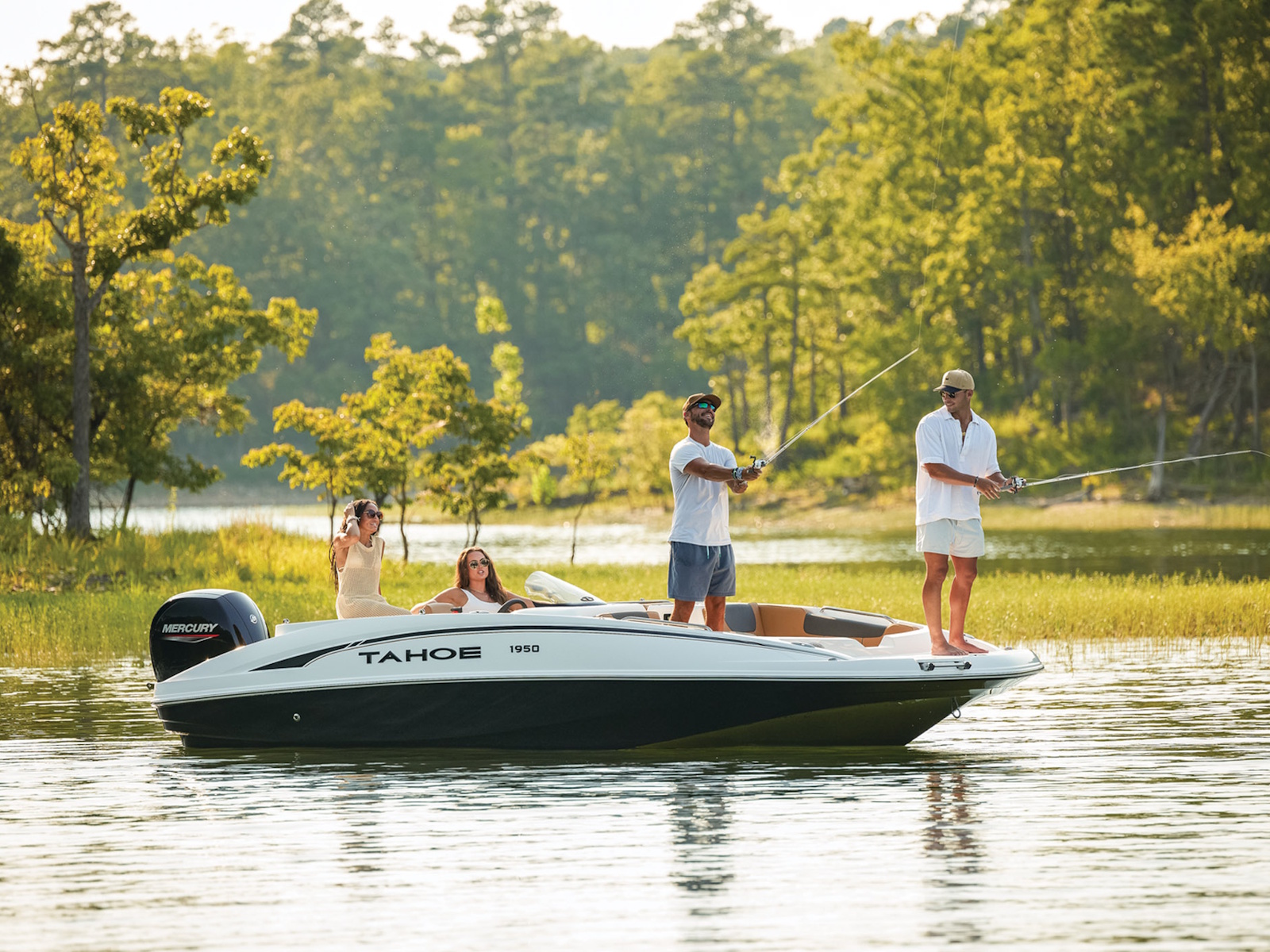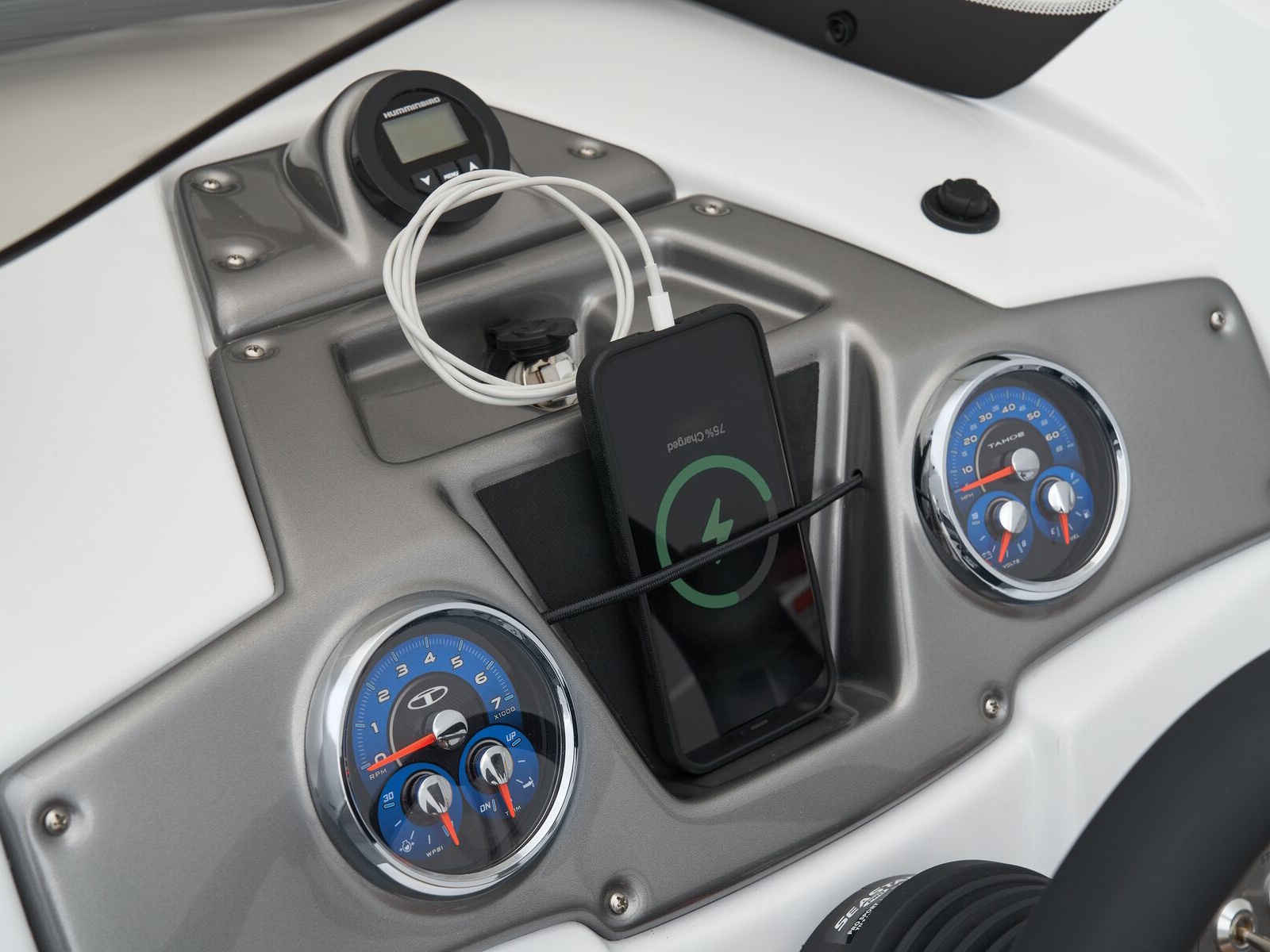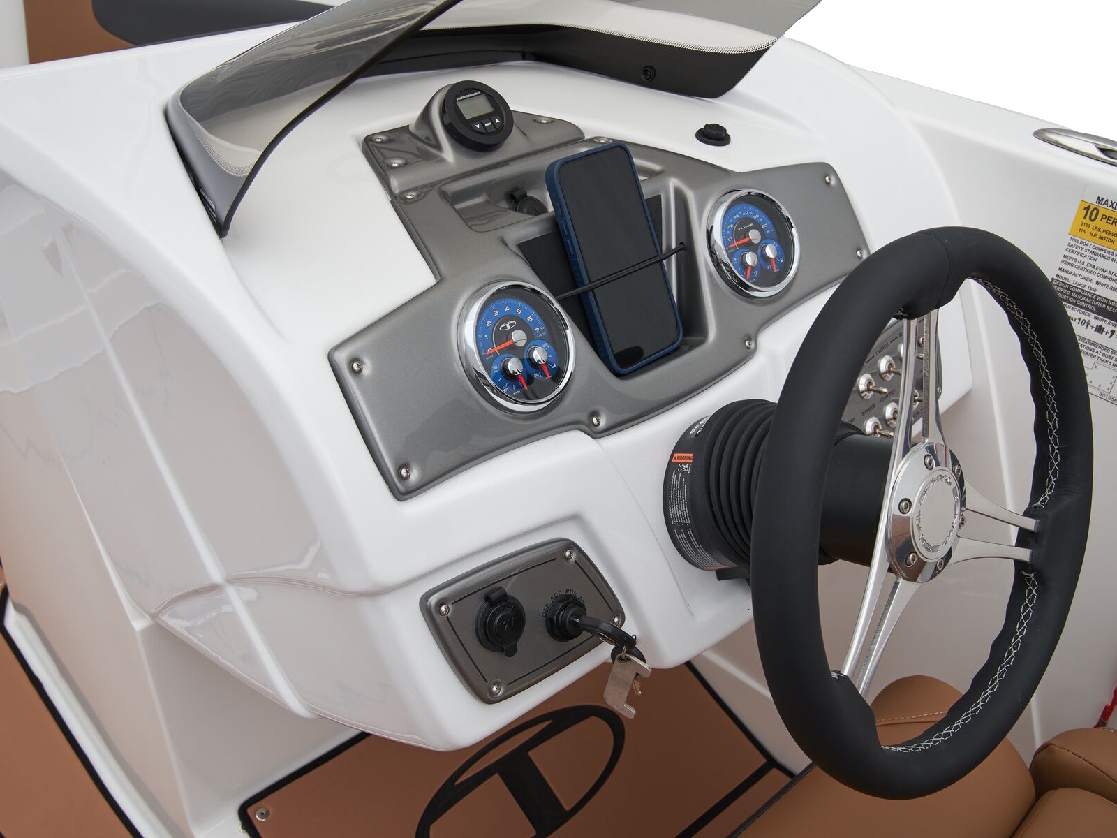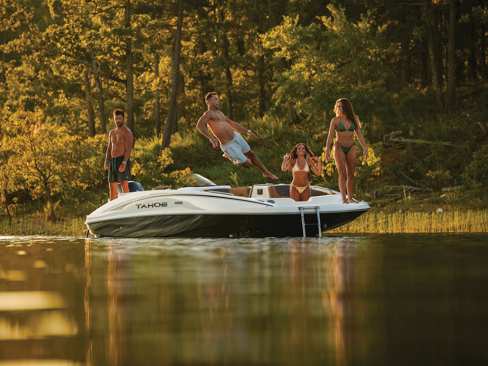 The helm boasts traditional gauges and switches for a more hands-on pilot experience. This TAHOE® is always ready to cast a line with its in-gunnel rod storage, standard 11.5-gal. livewell, and large swim platforms that can be upgraded with fishing seats. If the bites are slowing down, bring up the party playlist on the 4-speaker, Bluetooth®-compatible Kicker® stereo. After cooling off in the water, reboard with ease thanks to swim ladders at either end of the boat.